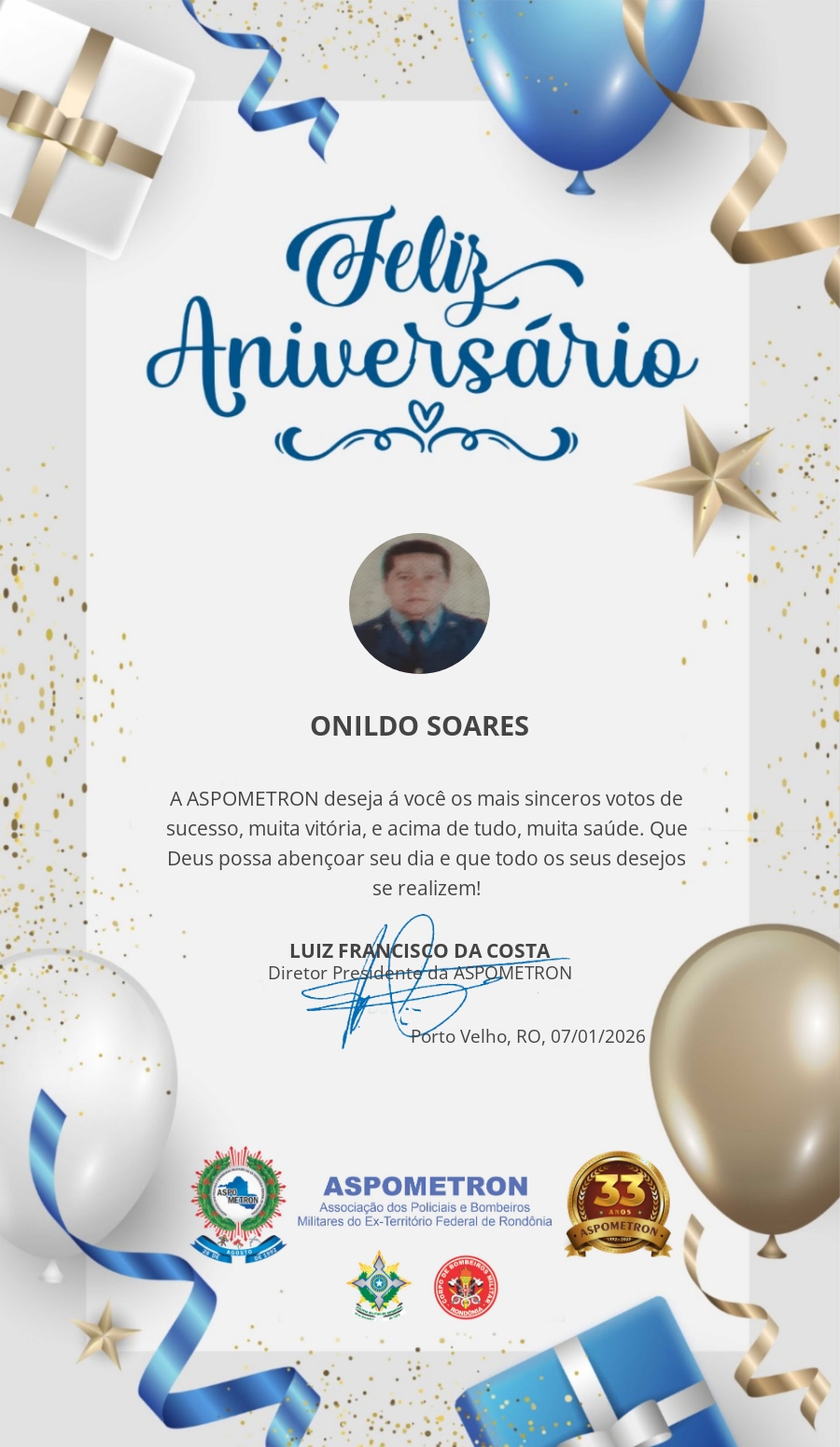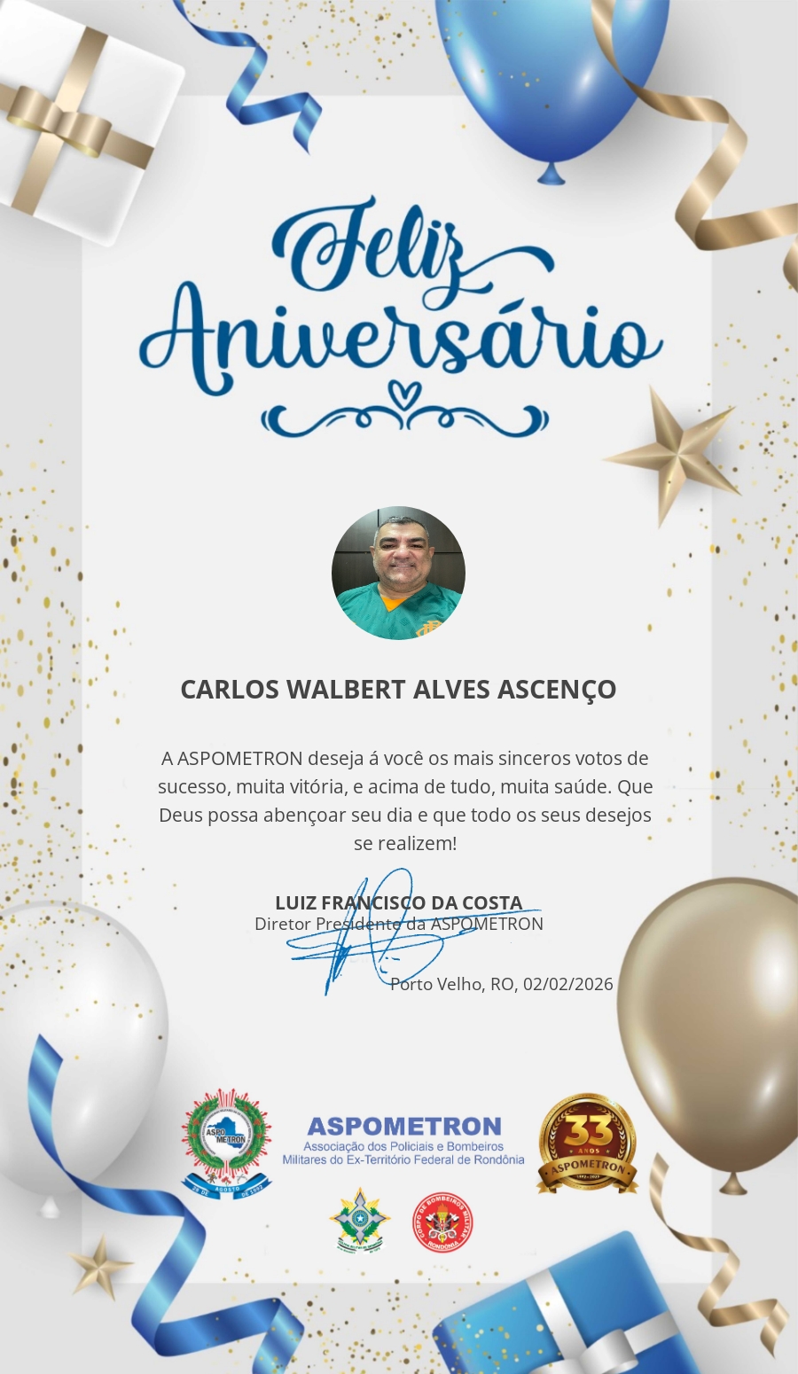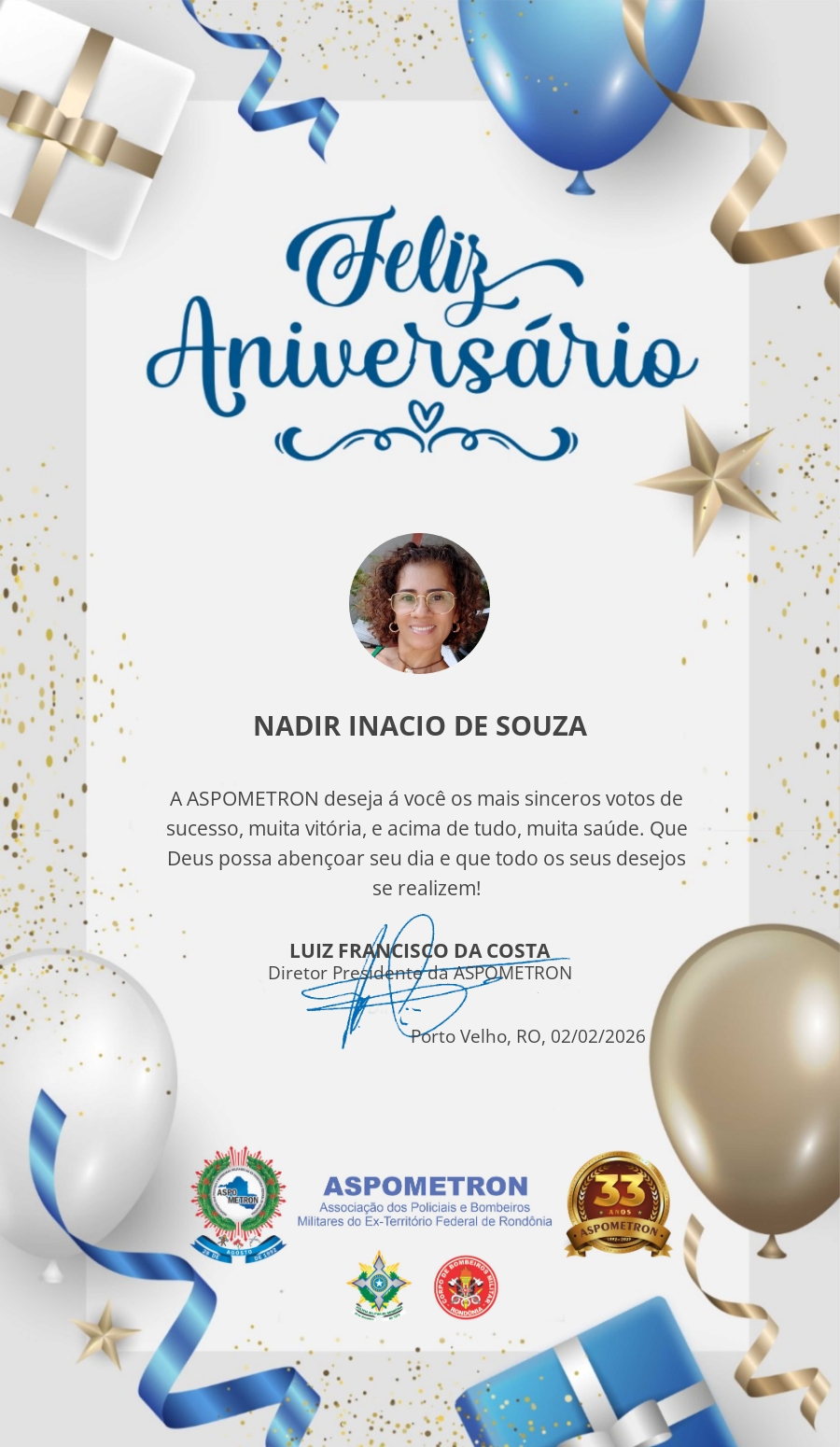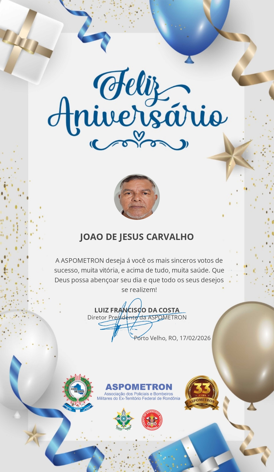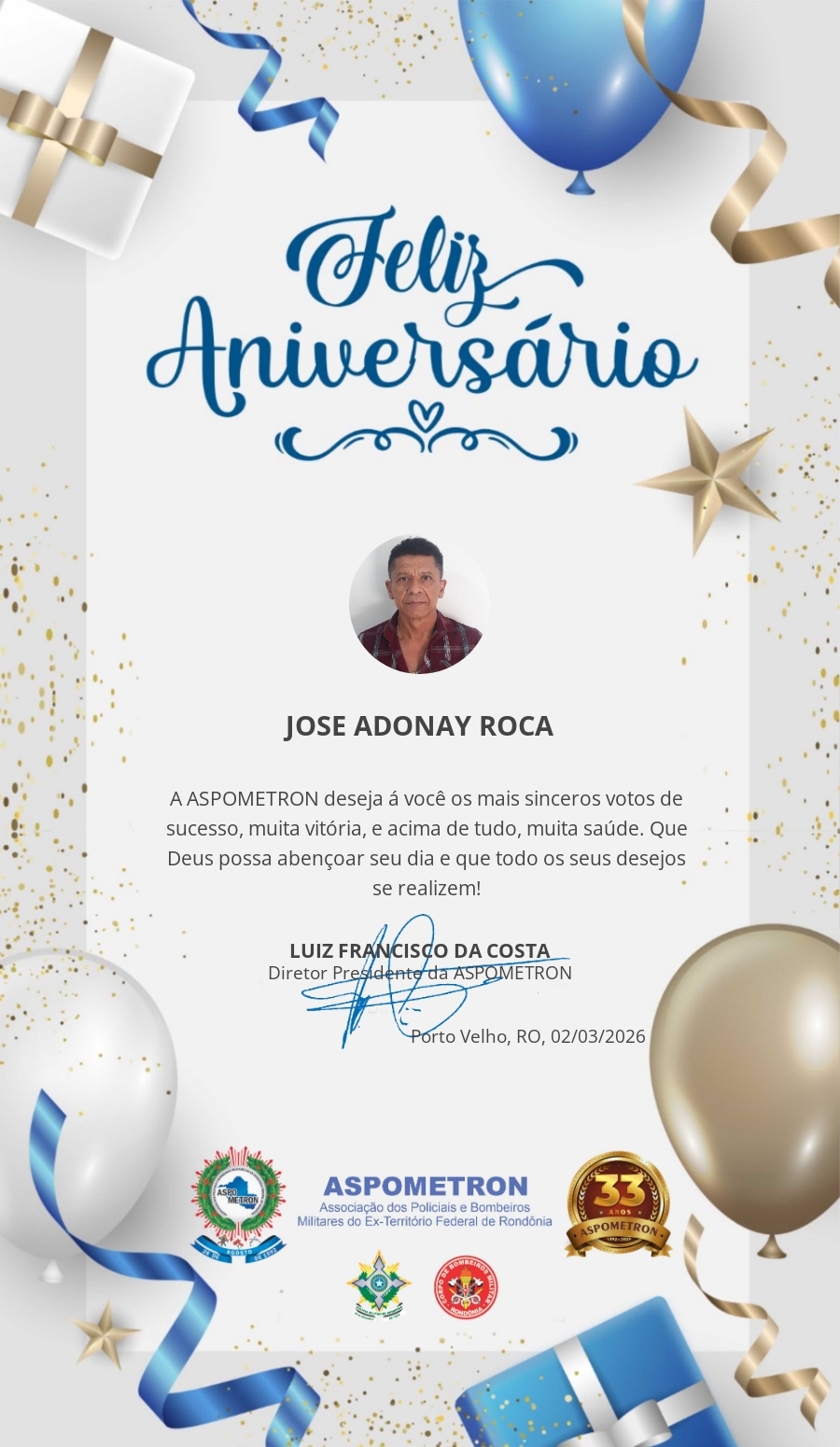 A ASPOMETRON lhe saúda pela passagem de mais um aniversário e deseja muito sucesso, saúde e alegrias! PARABÉNS Guerreiros(as)!