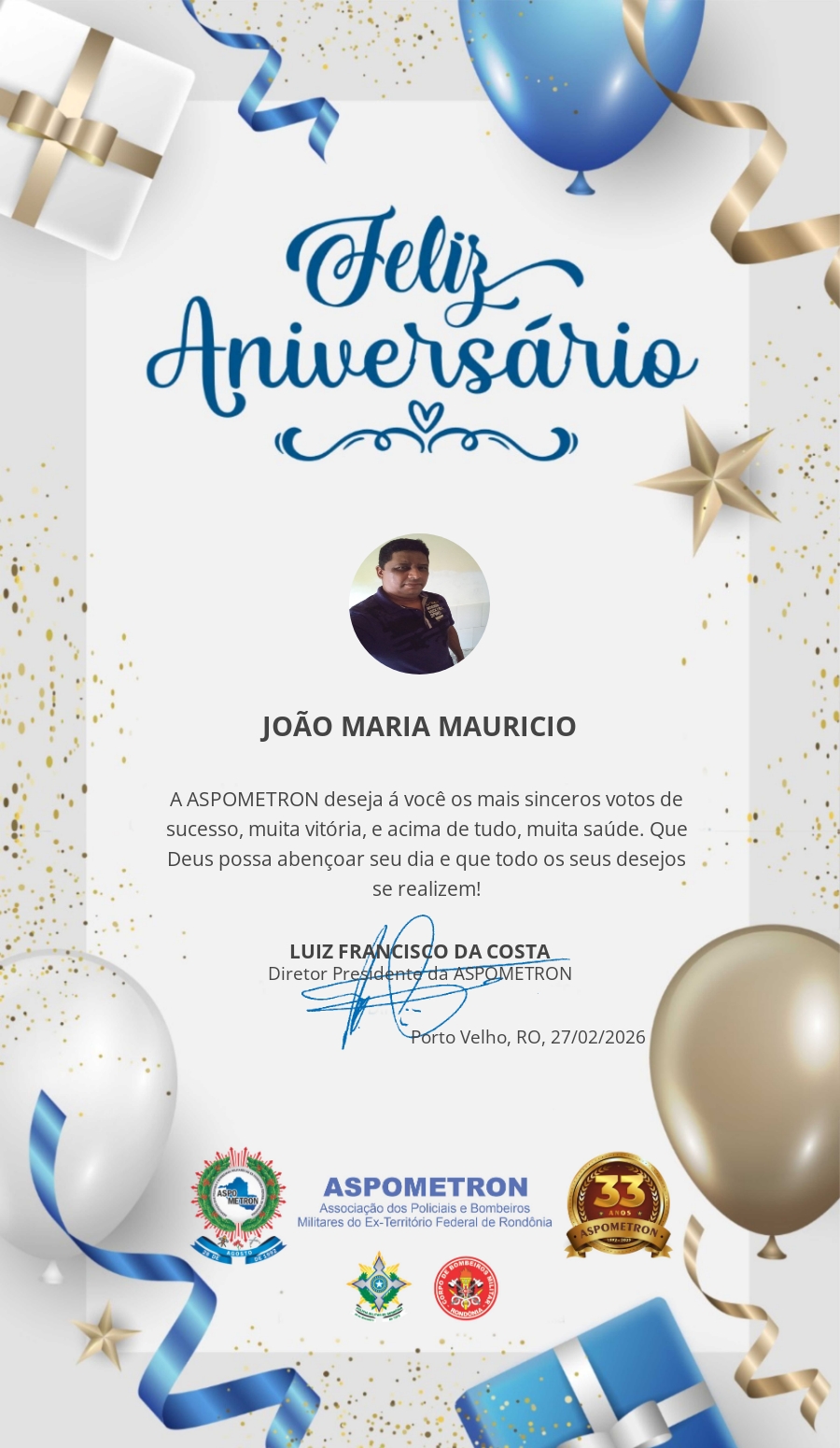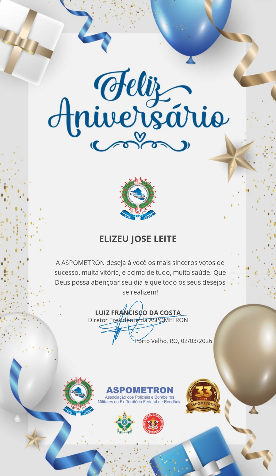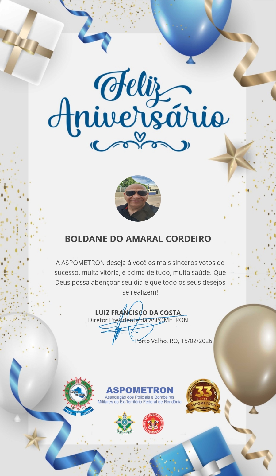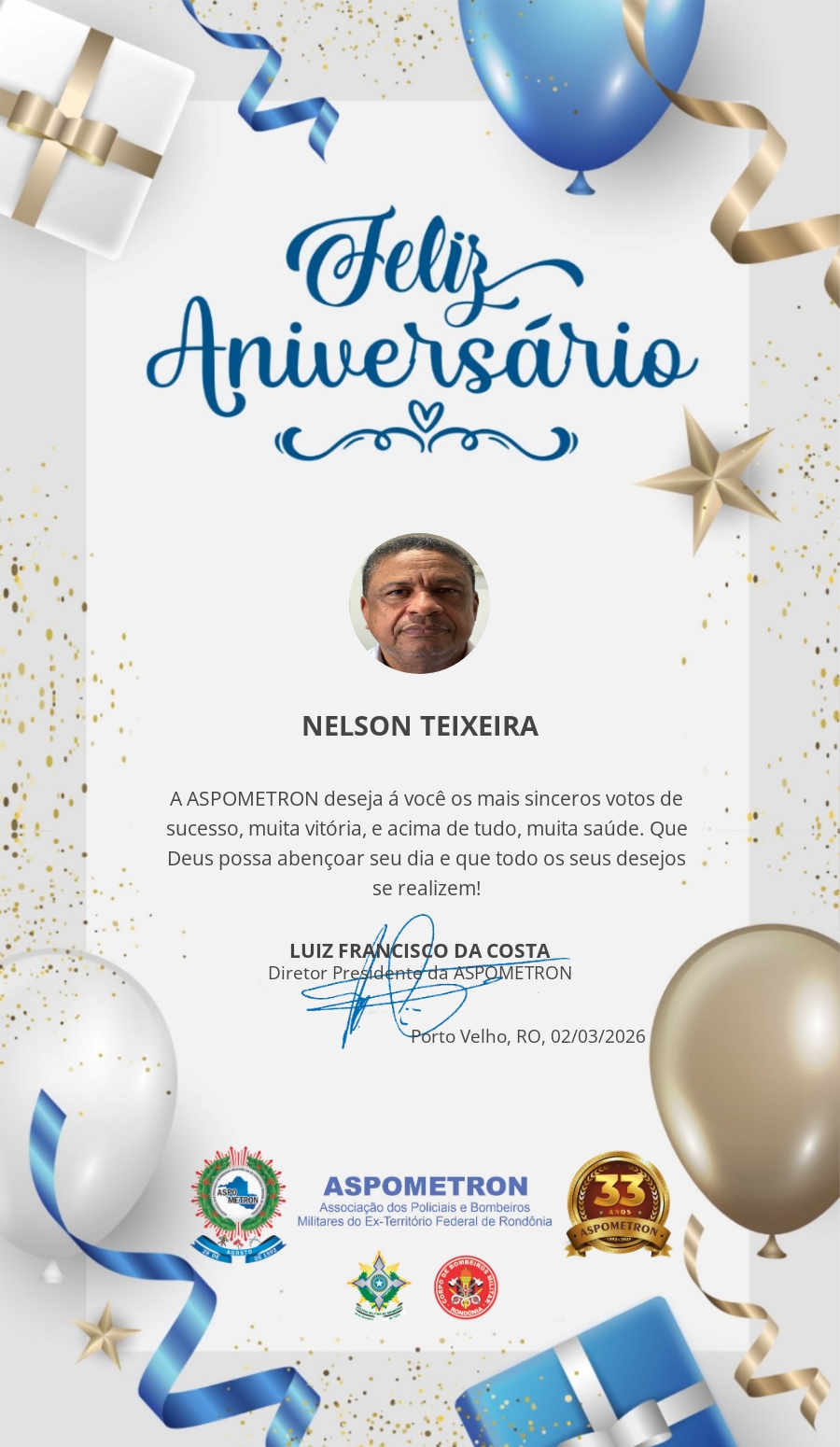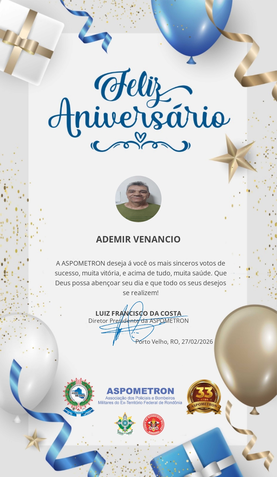 A ASPOMETRON lhe saúda pela passagem de mais um aniversário e deseja muito sucesso, saúde e alegrias! PARABÉNS Guerreiros(as)!