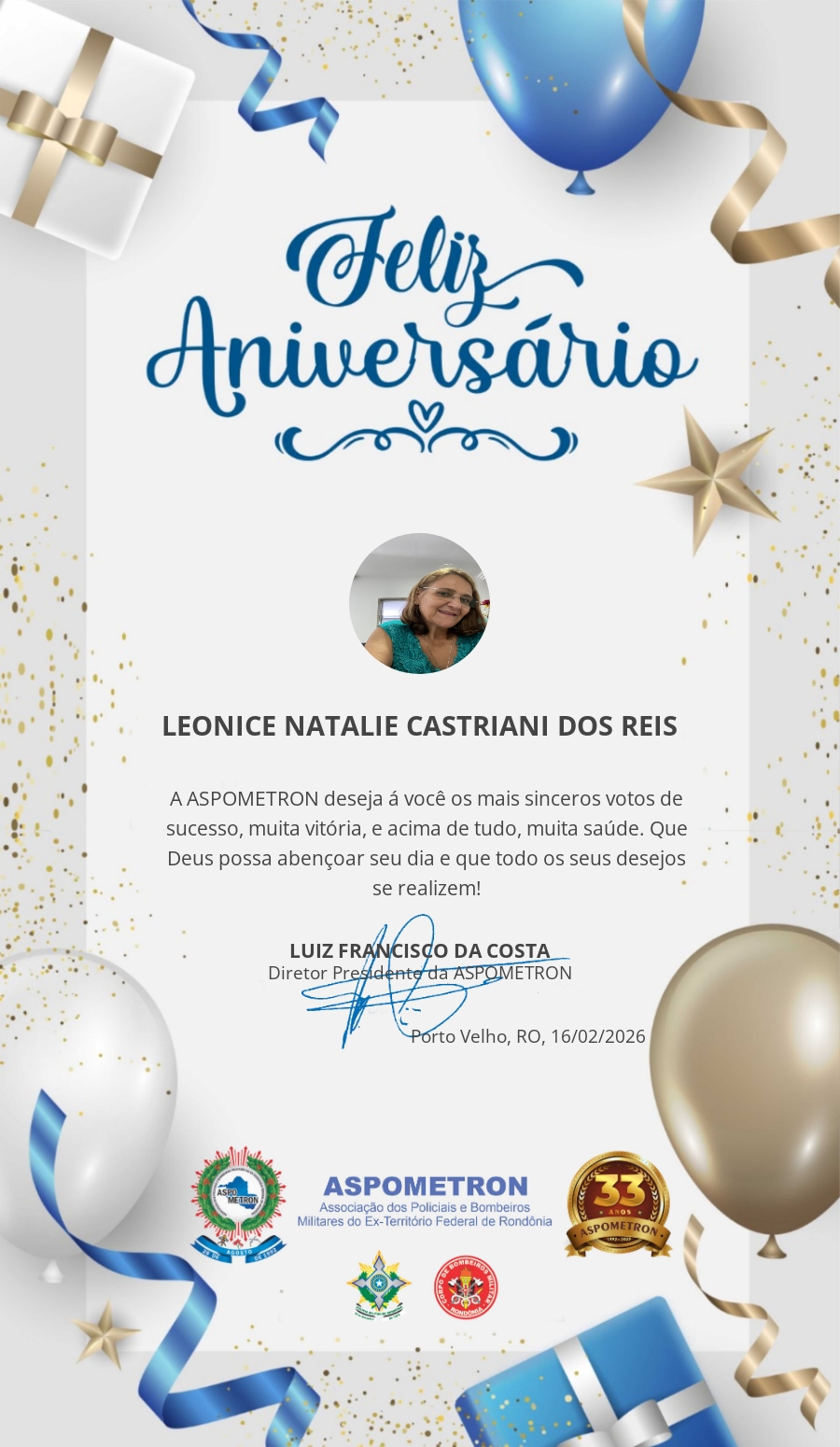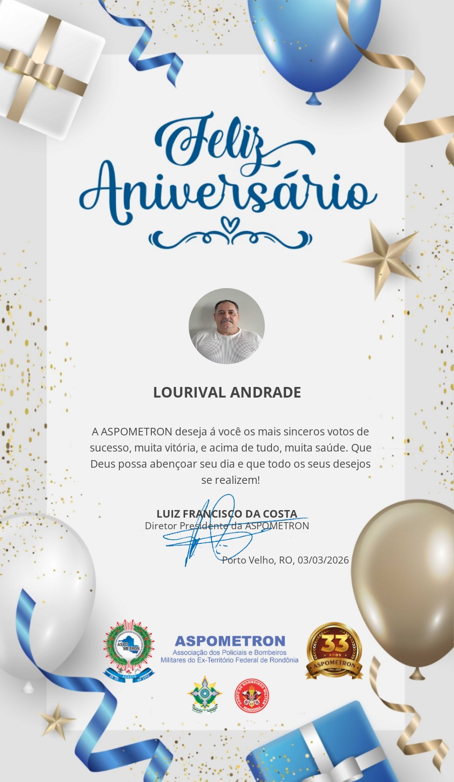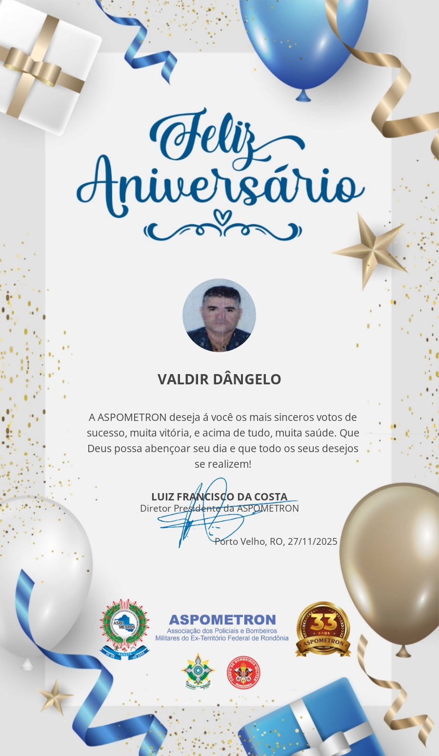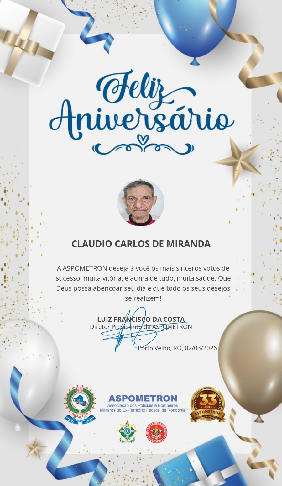 A ASPOMETRON lhe saúda pela passagem de mais um aniversário e deseja muito sucesso, saúde e alegrias! PARABÉNS Guerreiros(as)!