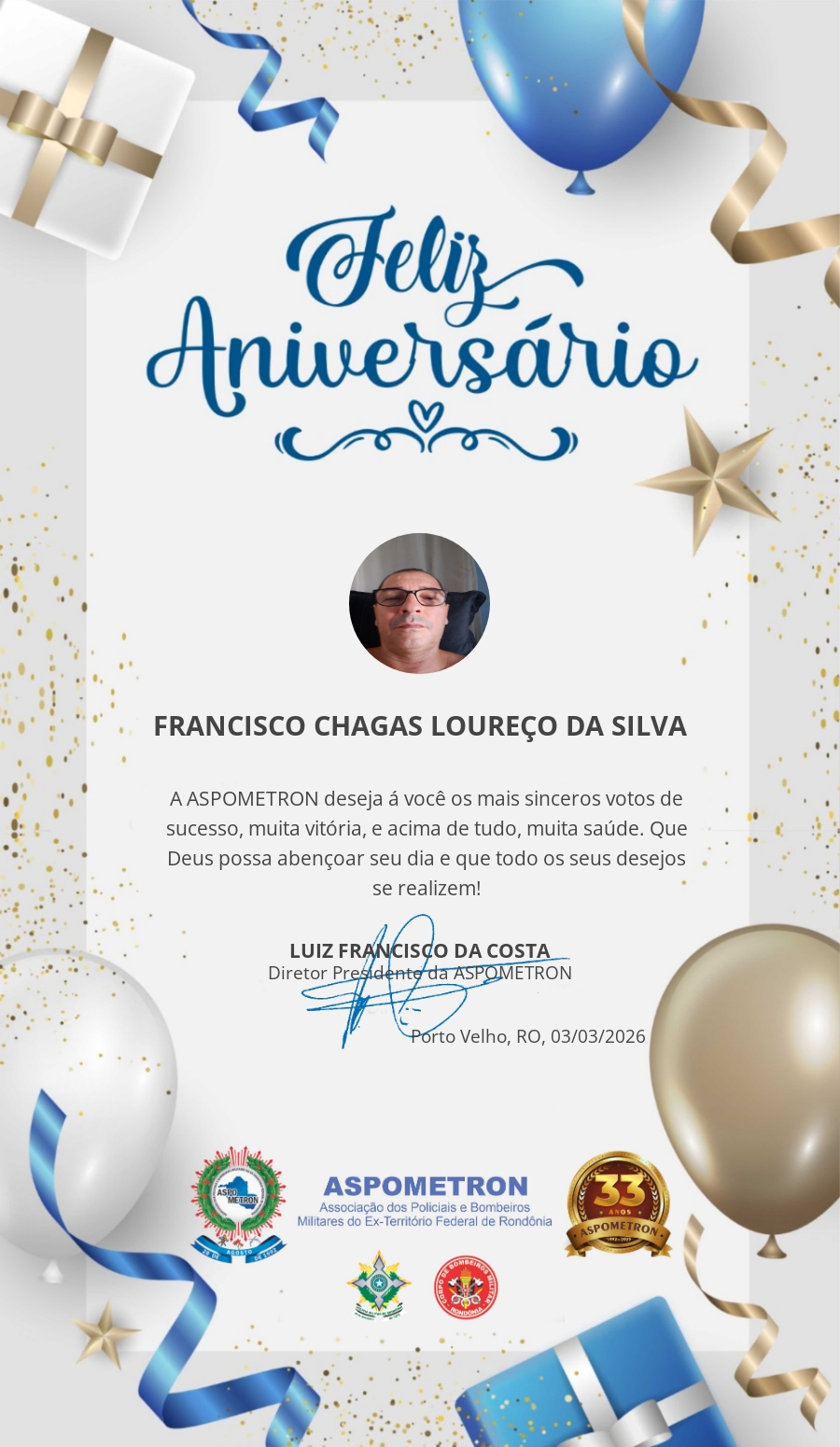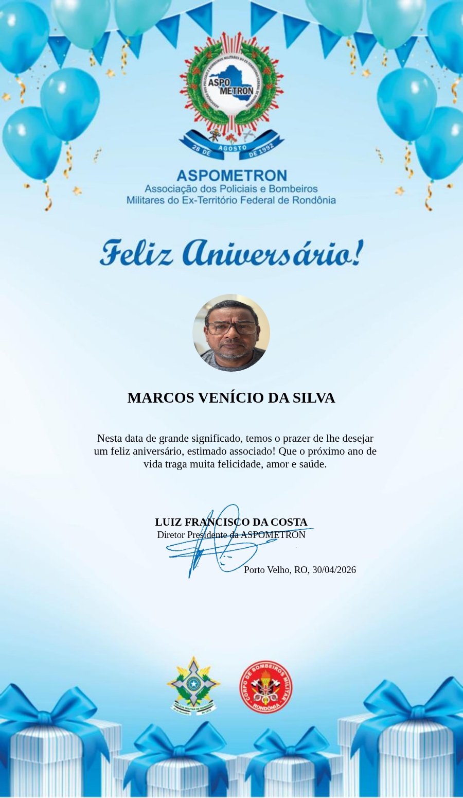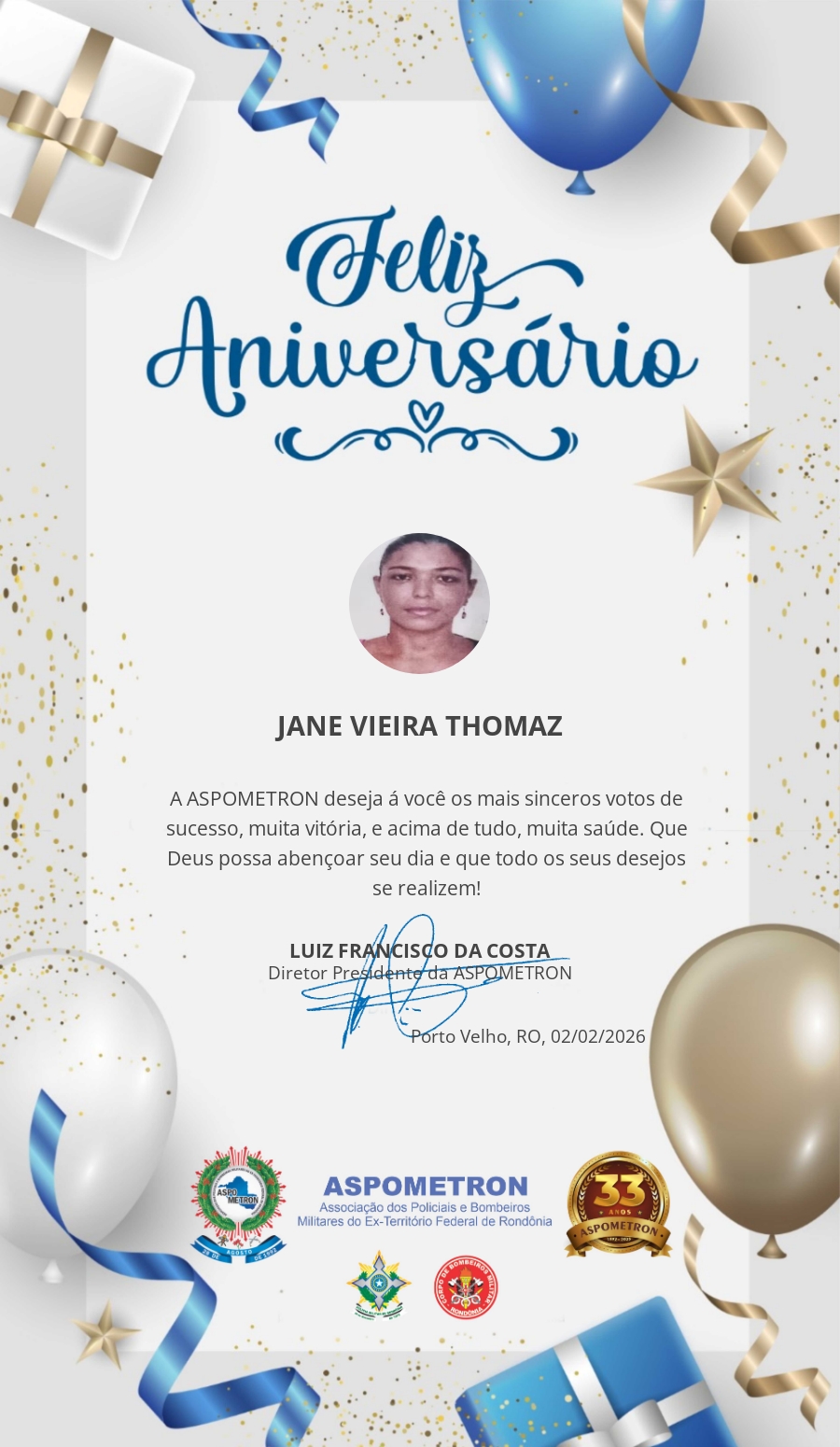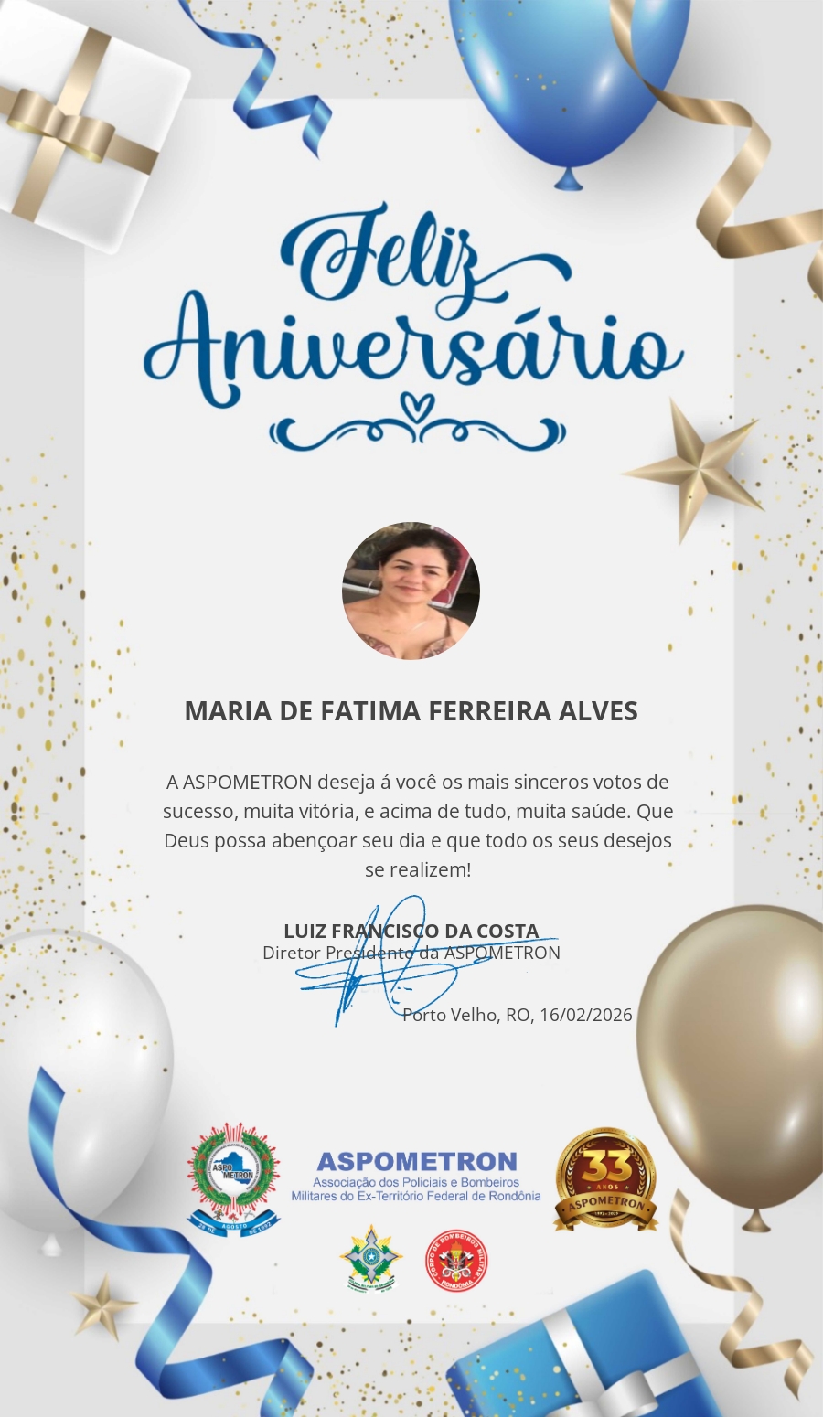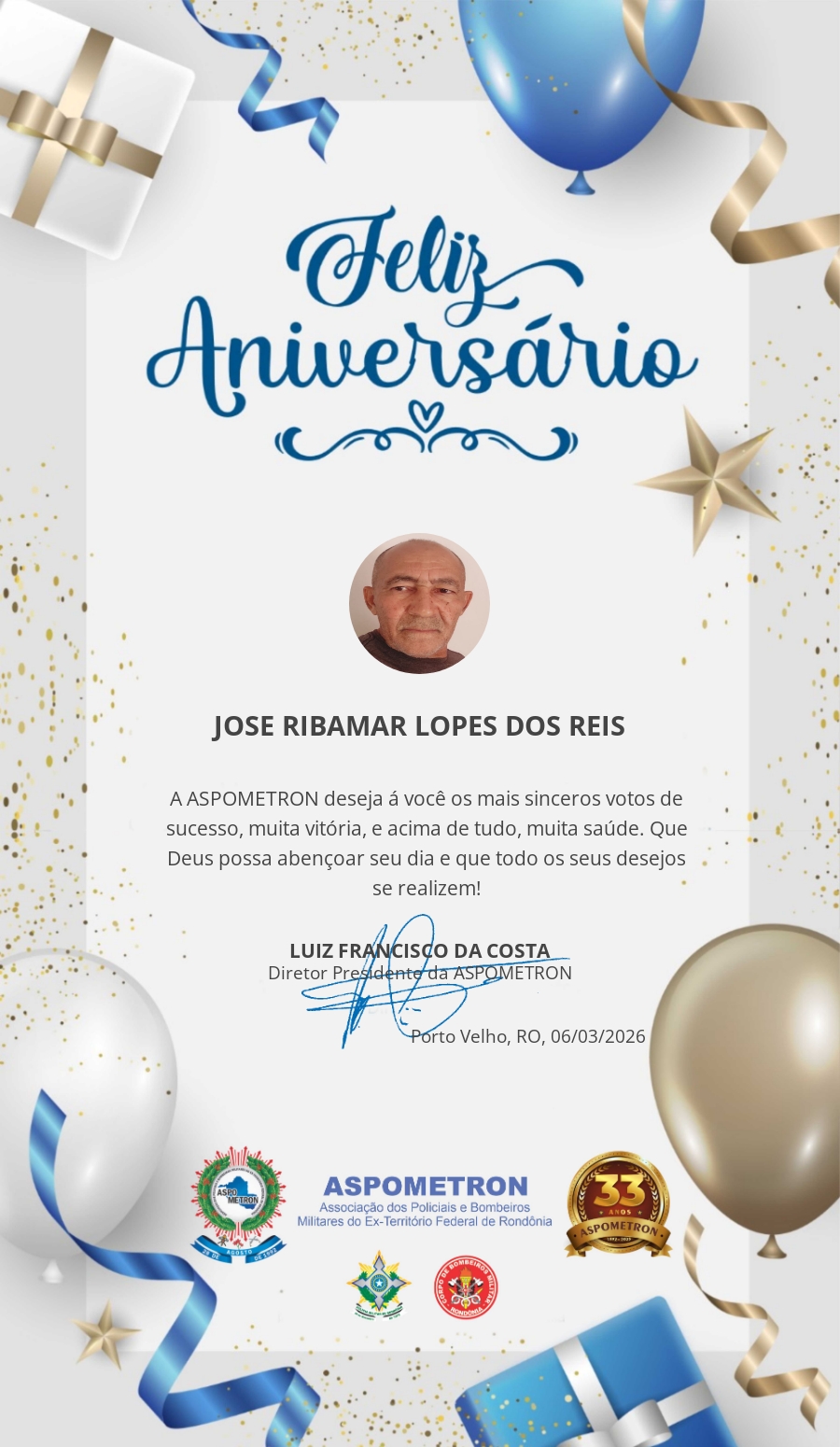 A ASPOMETRON lhe saúda pela passagem de mais um aniversário e deseja muito sucesso, saúde e alegrias! PARABÉNS Guerreiros(as)!