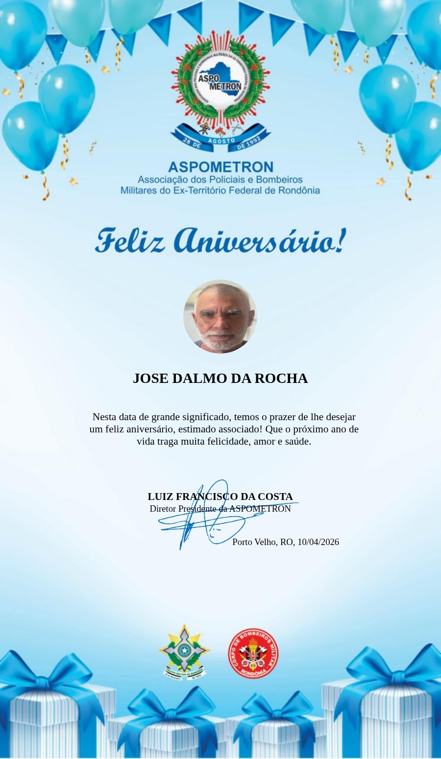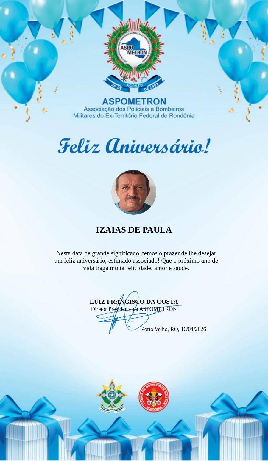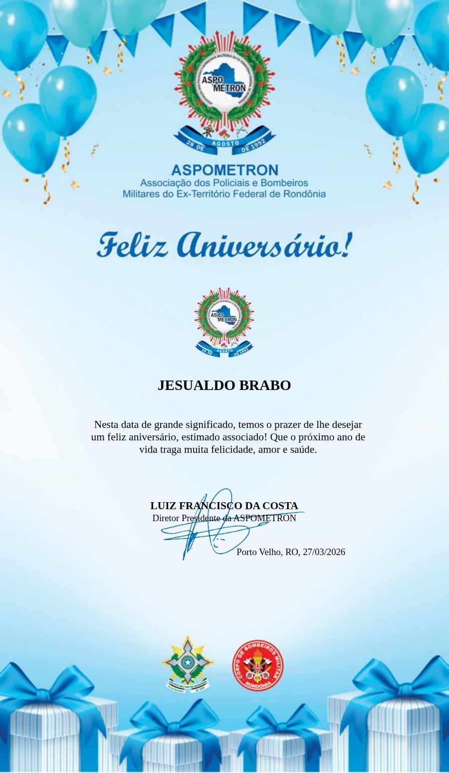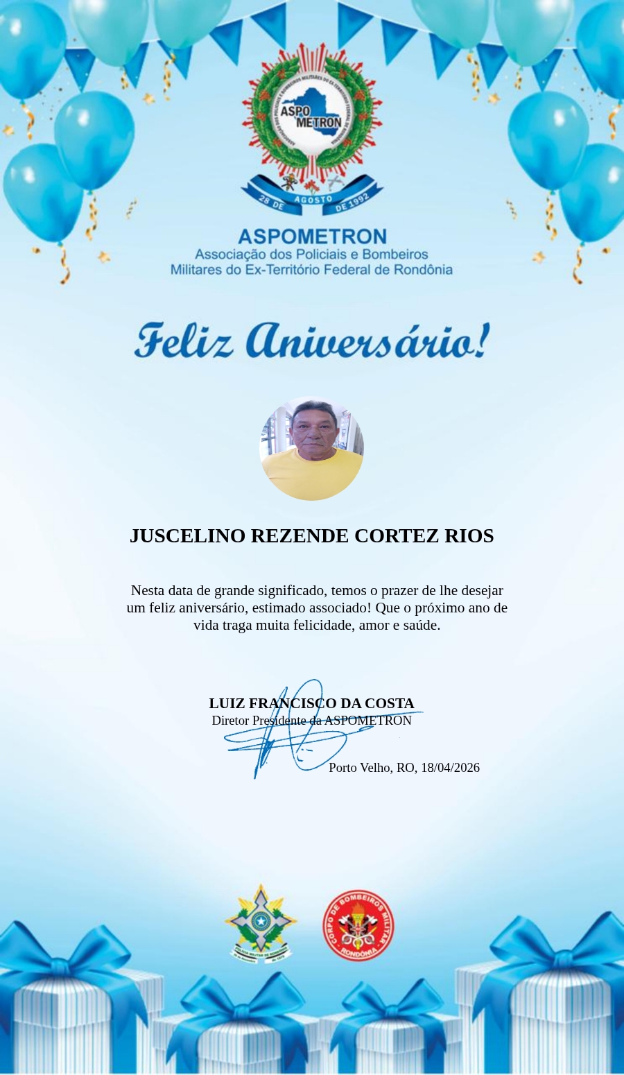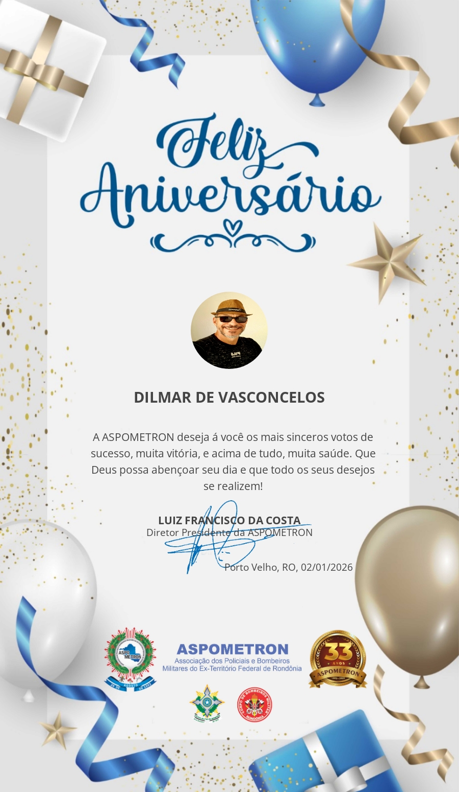 A ASPOMETRON lhe saúda pela passagem de mais um aniversário e deseja muito sucesso, saúde e alegrias! PARABÉNS Guerreiros(as)!