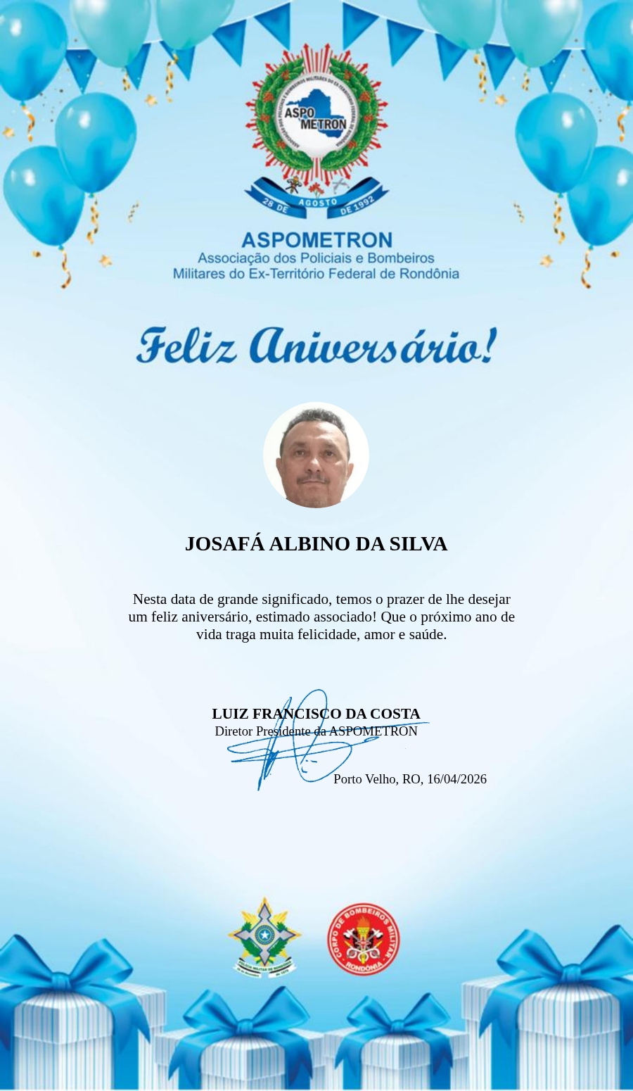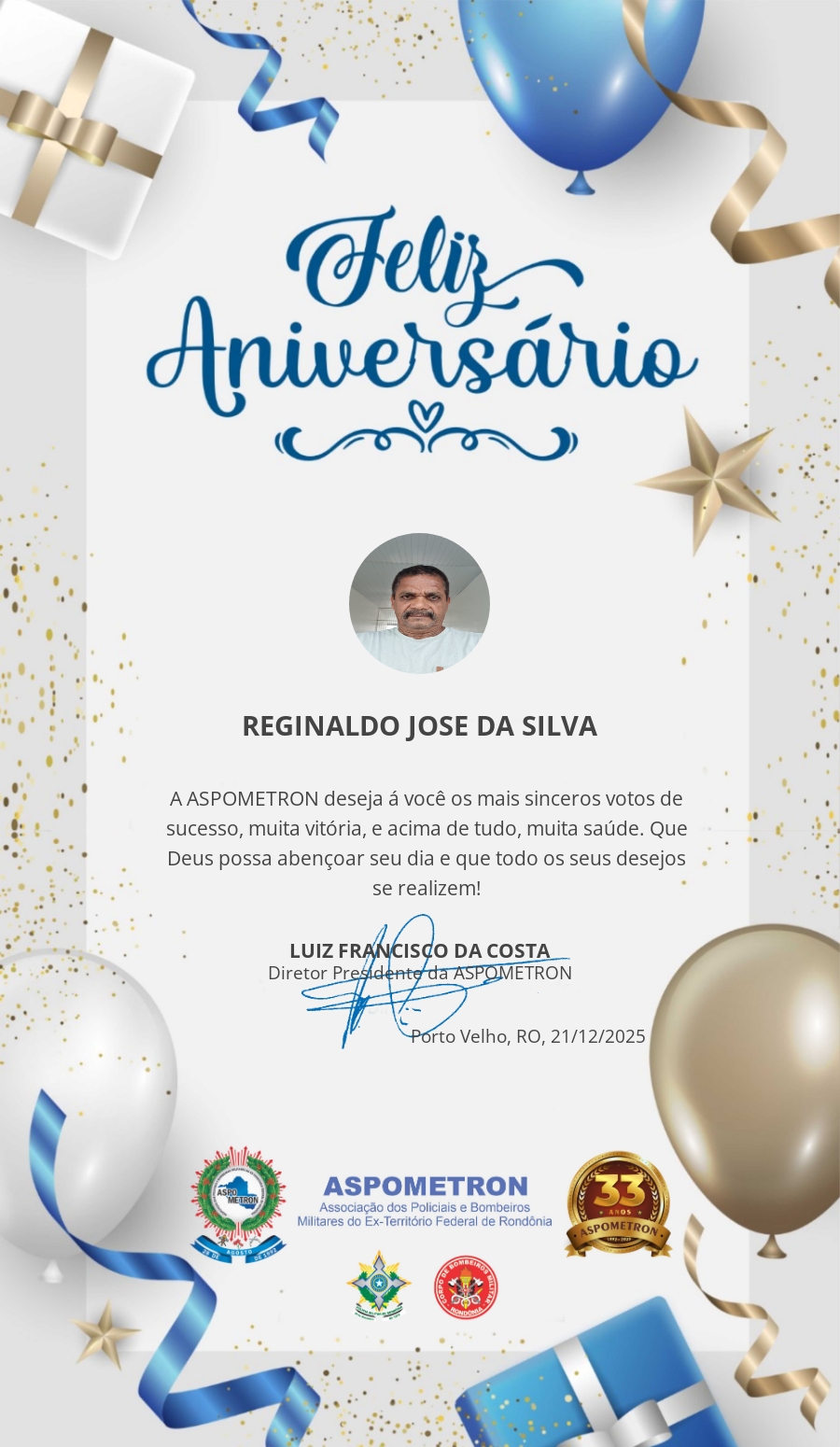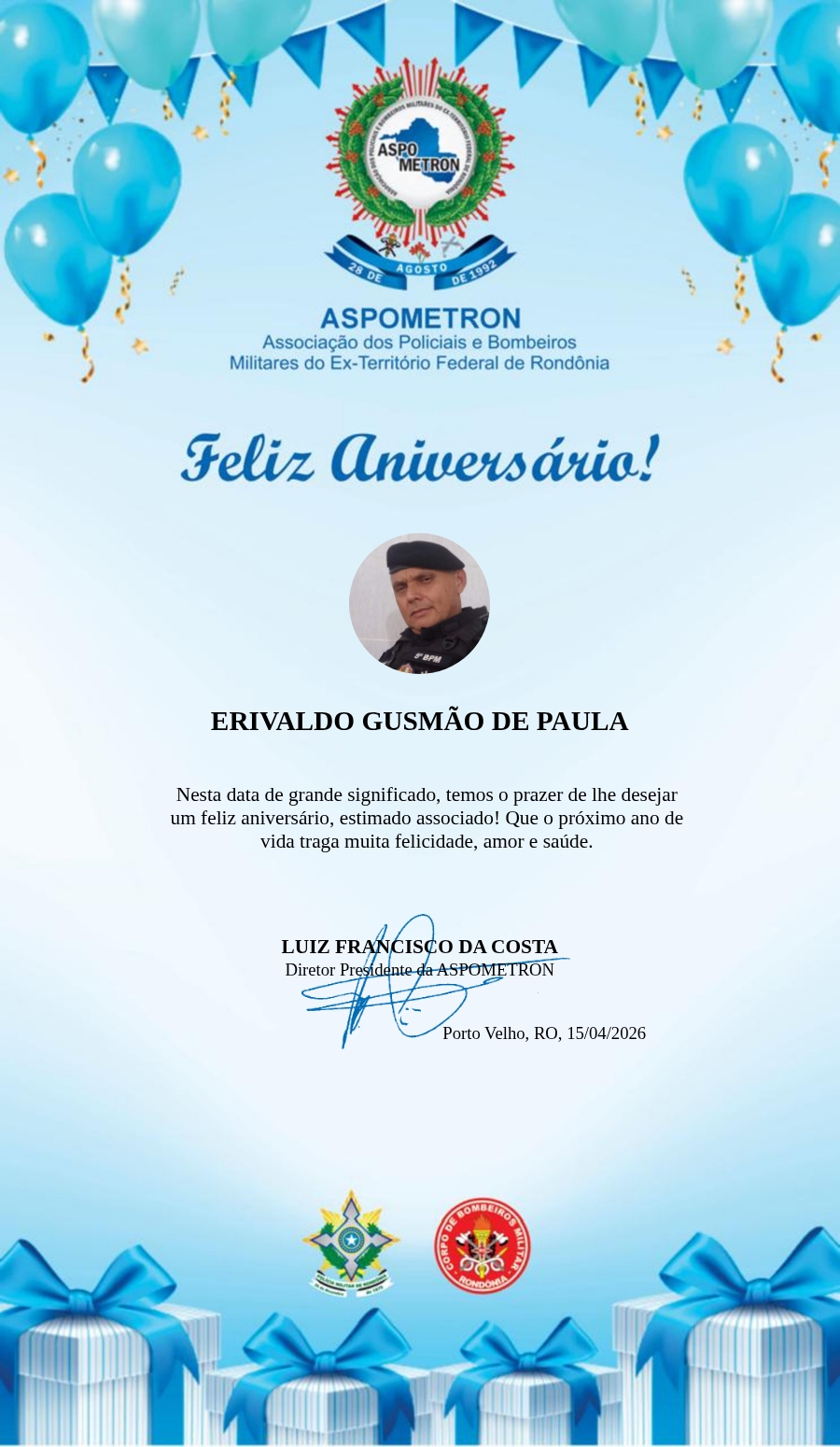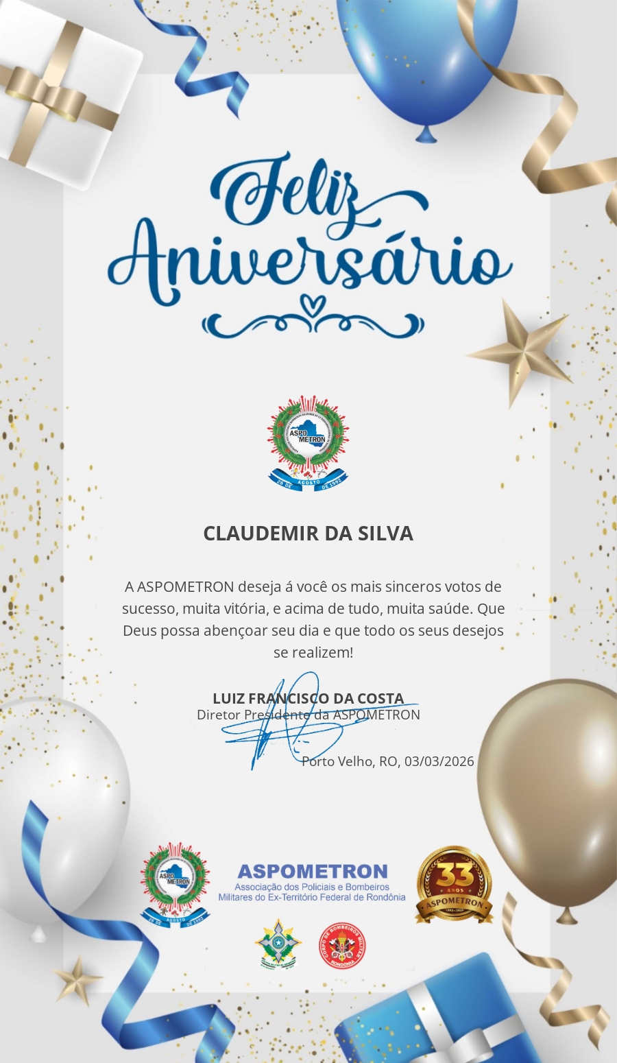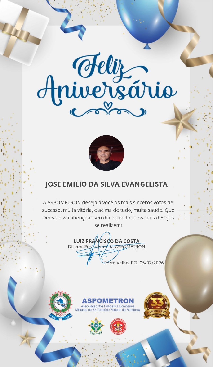 A ASPOMETRON lhe saúda pela passagem de mais um aniversário e deseja muito sucesso, saúde e alegrias! PARABÉNS Guerreiros(as)!