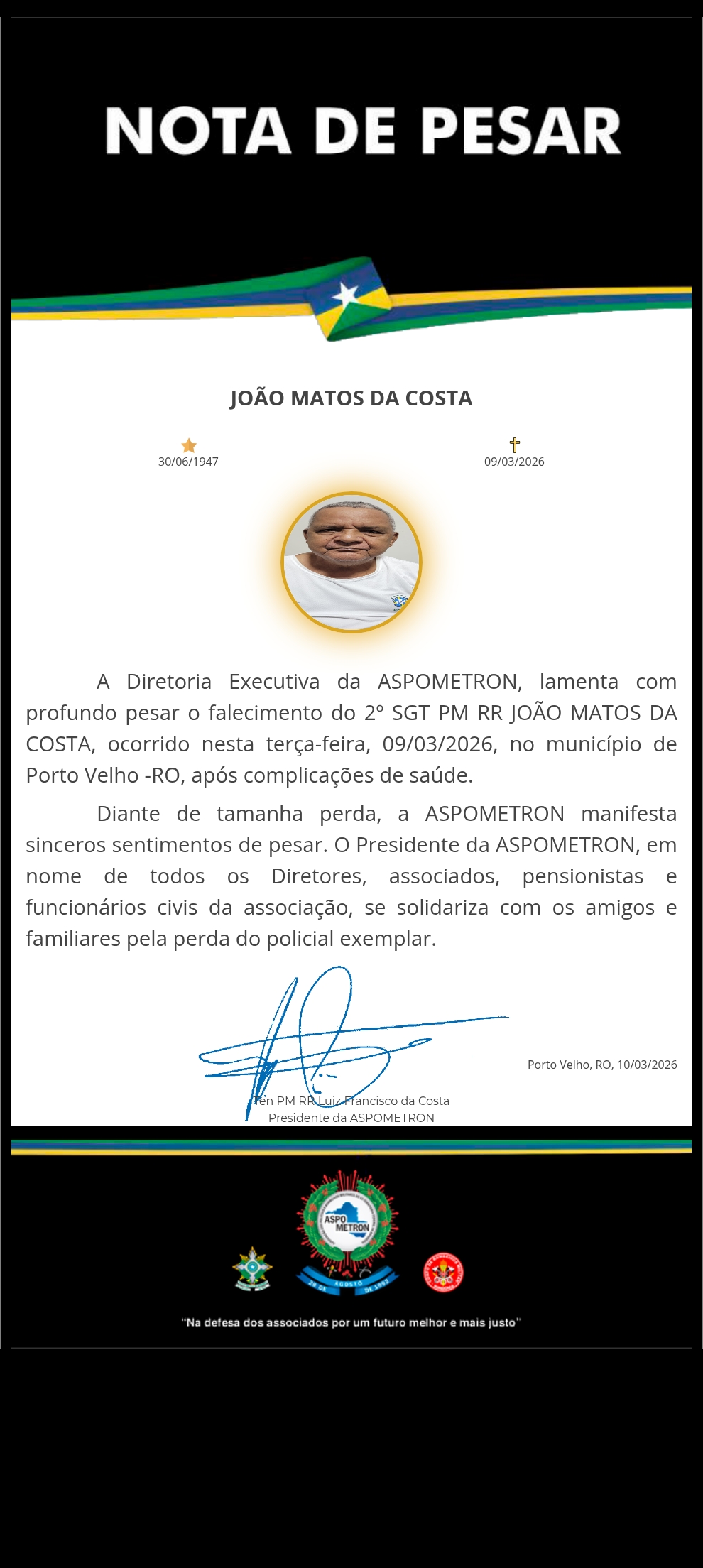 A ASPOMETRON apresenta sua solidariedade à família enlutada!