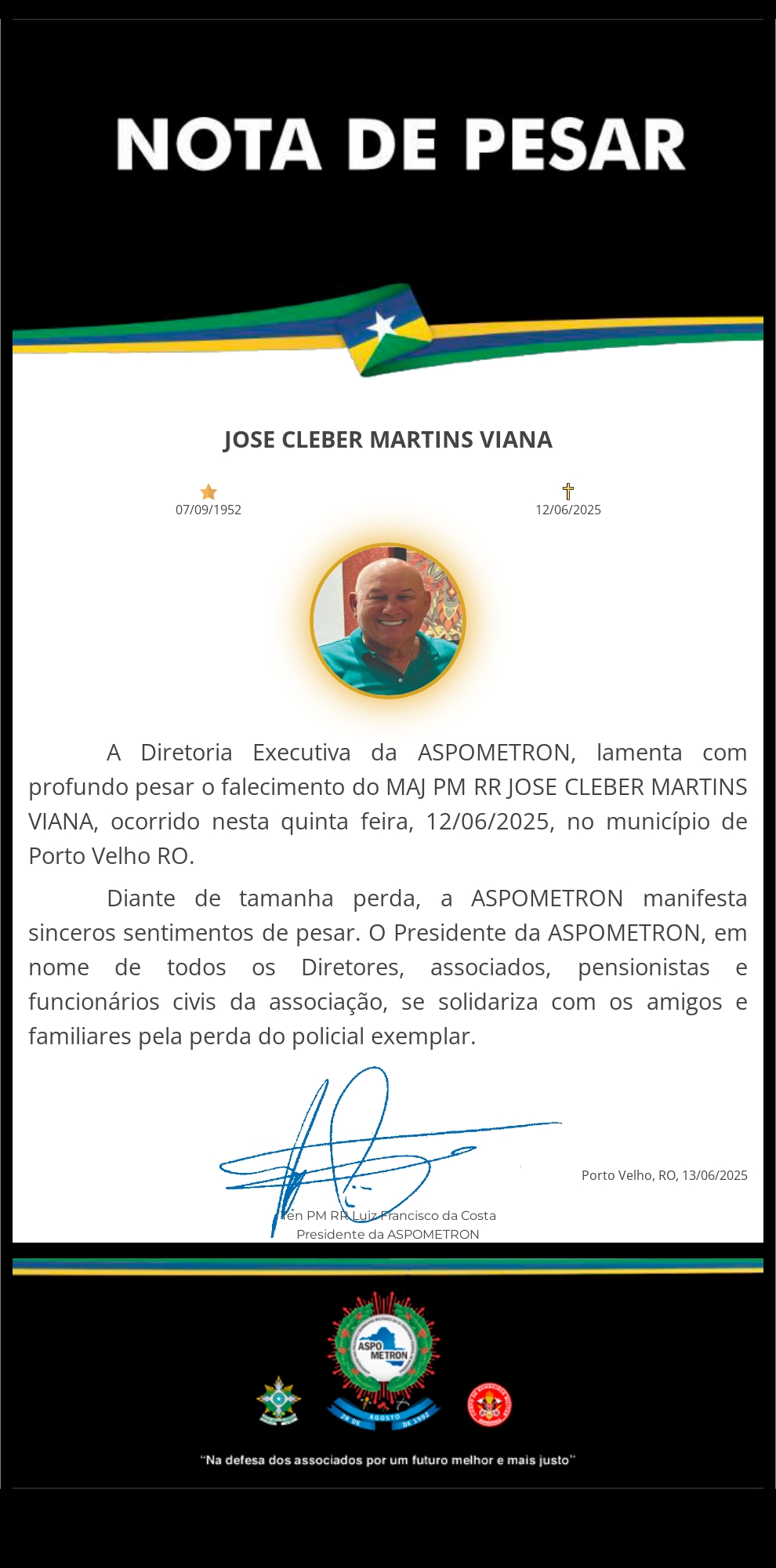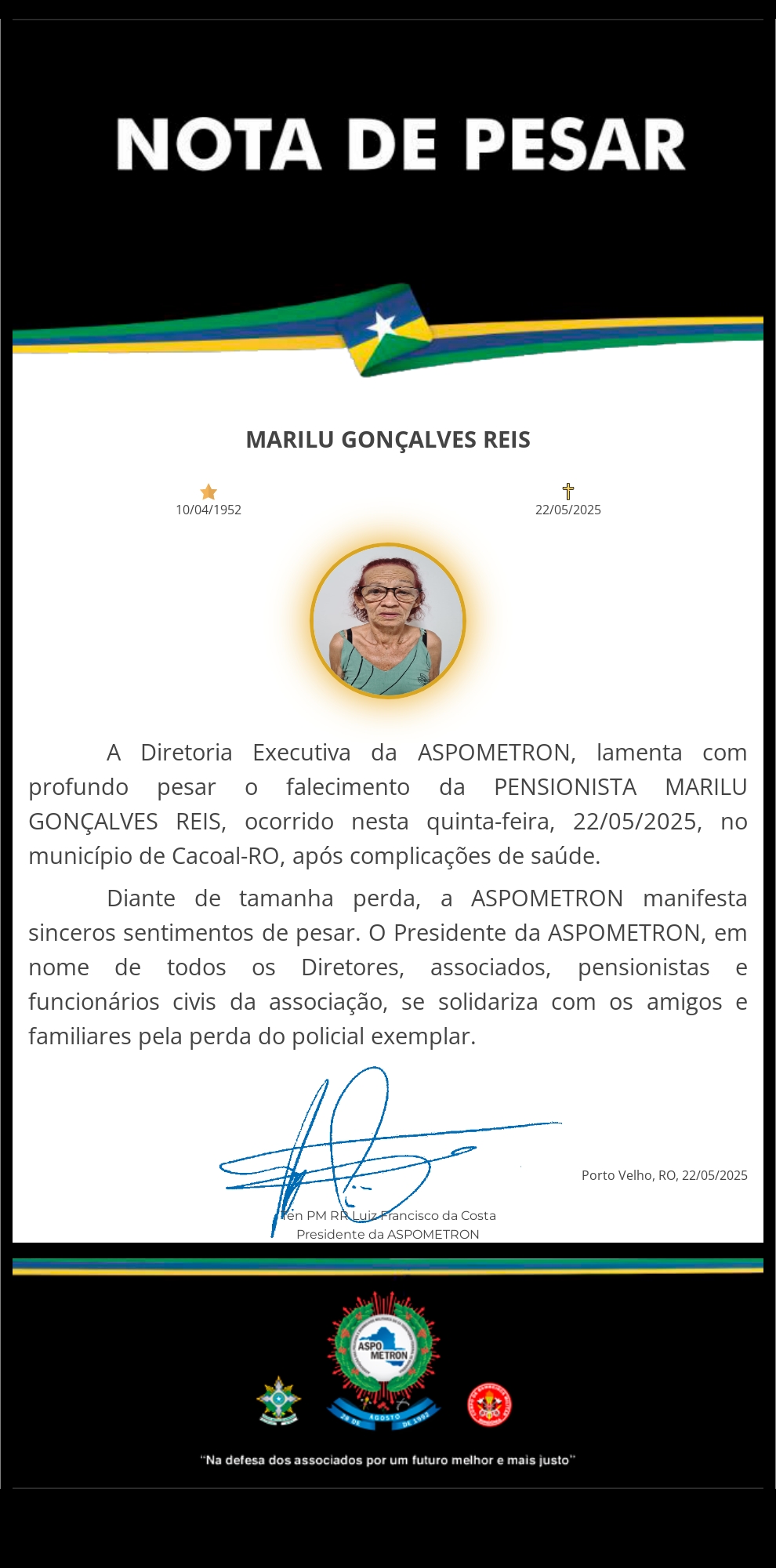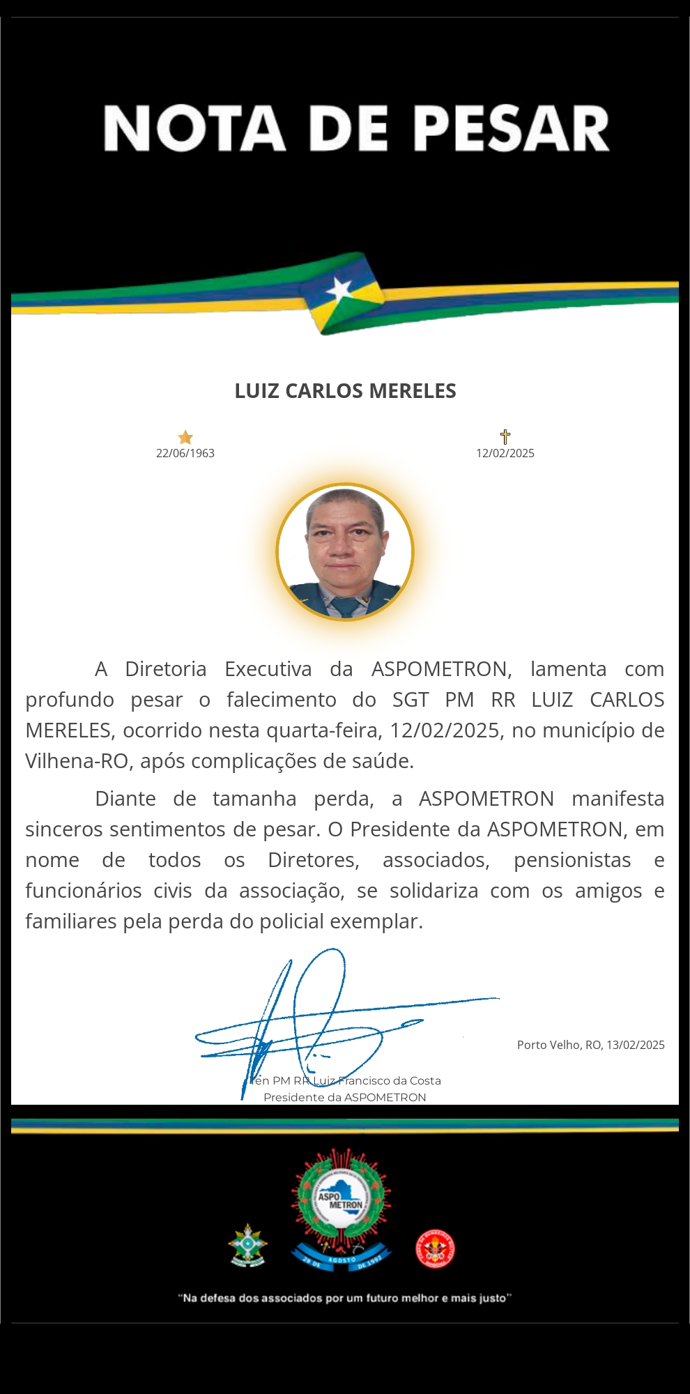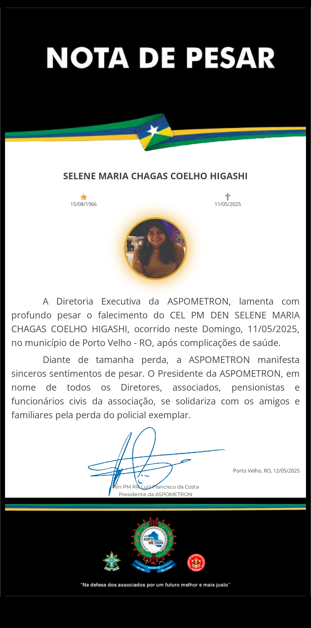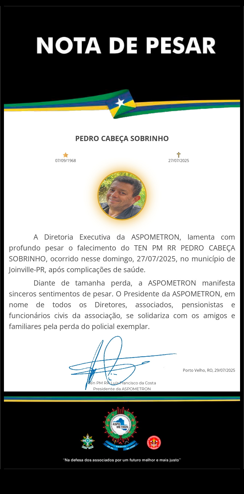 A ASPOMETRON apresenta sua solidariedade à família enlutada!