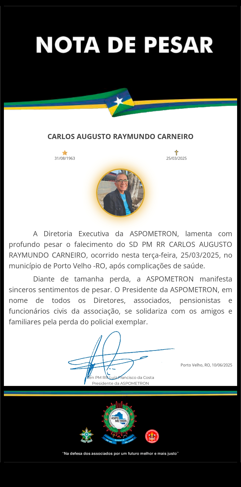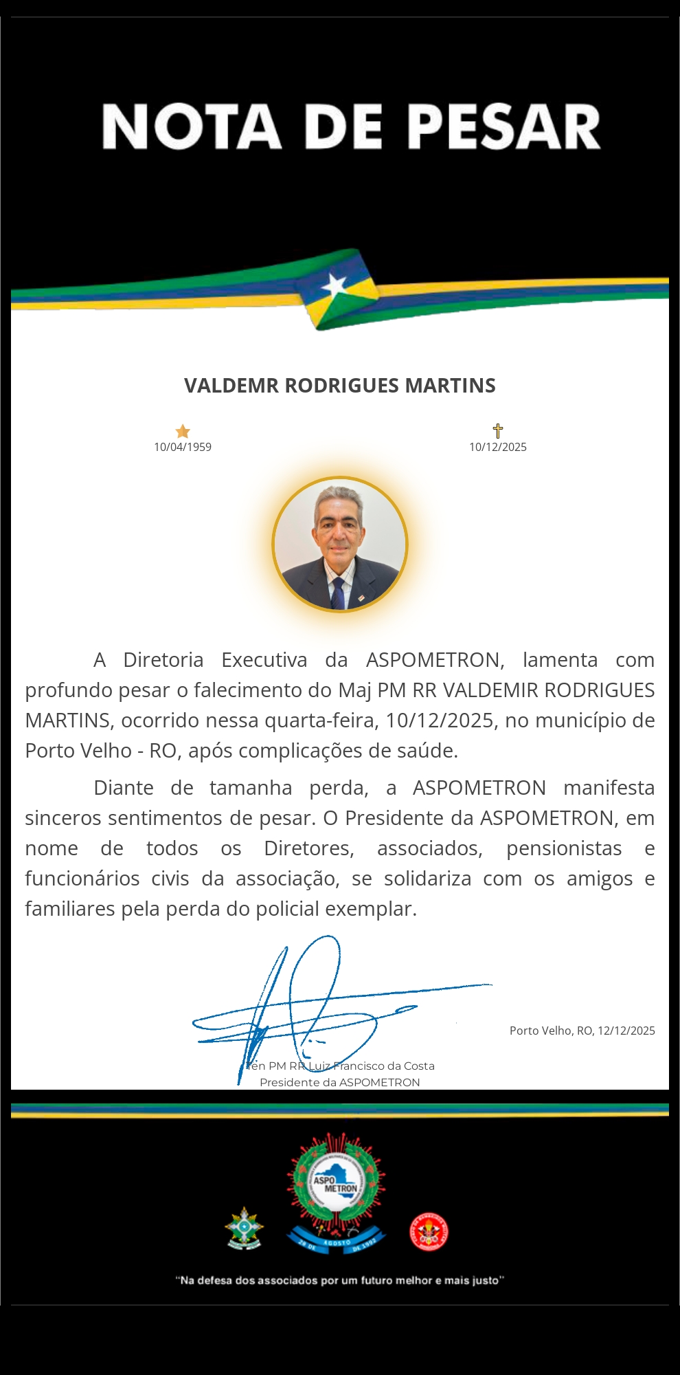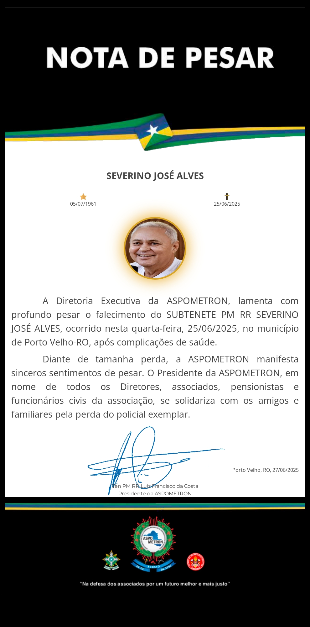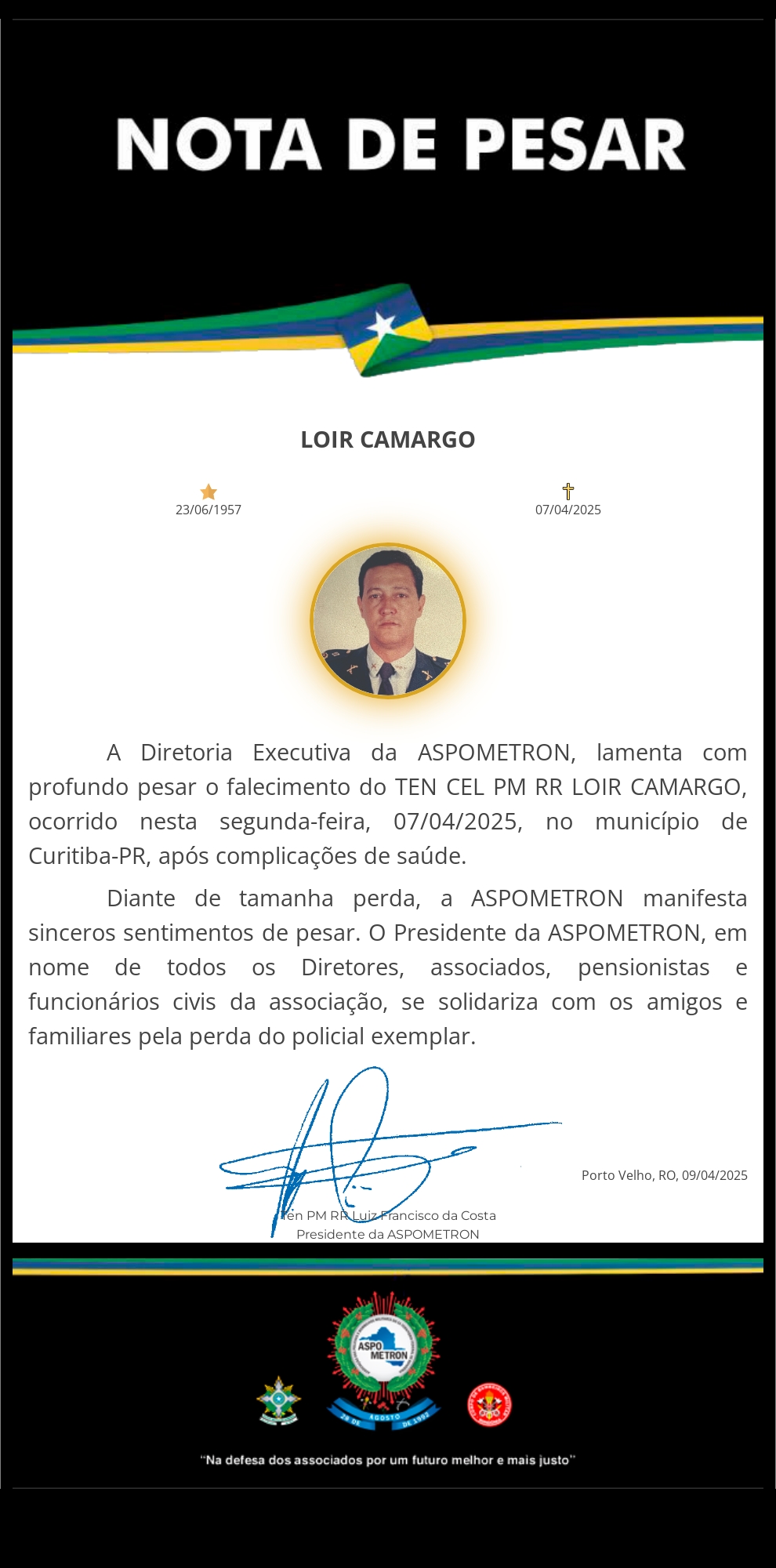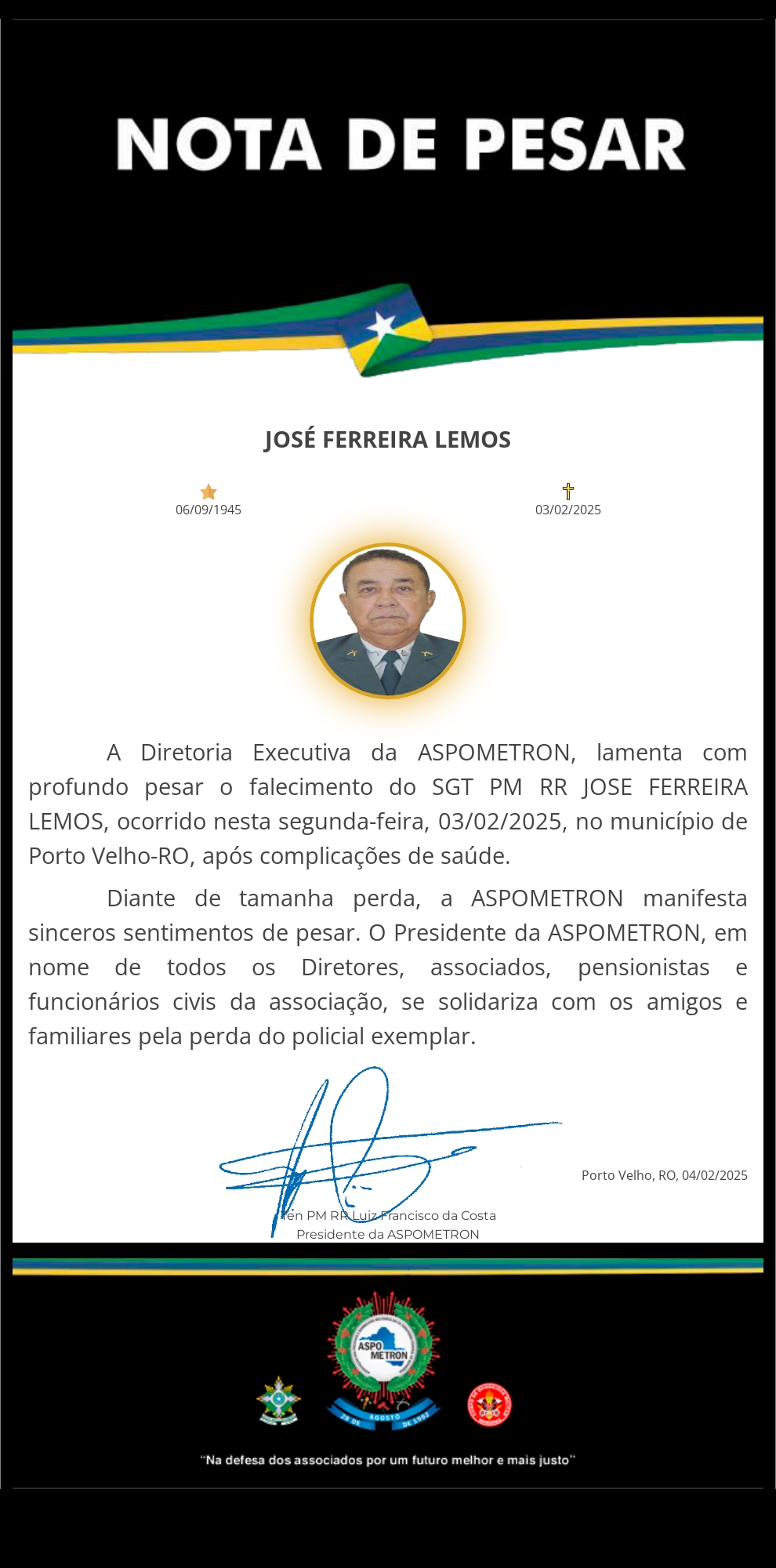 A ASPOMETRON apresenta sua solidariedade à família enlutada!