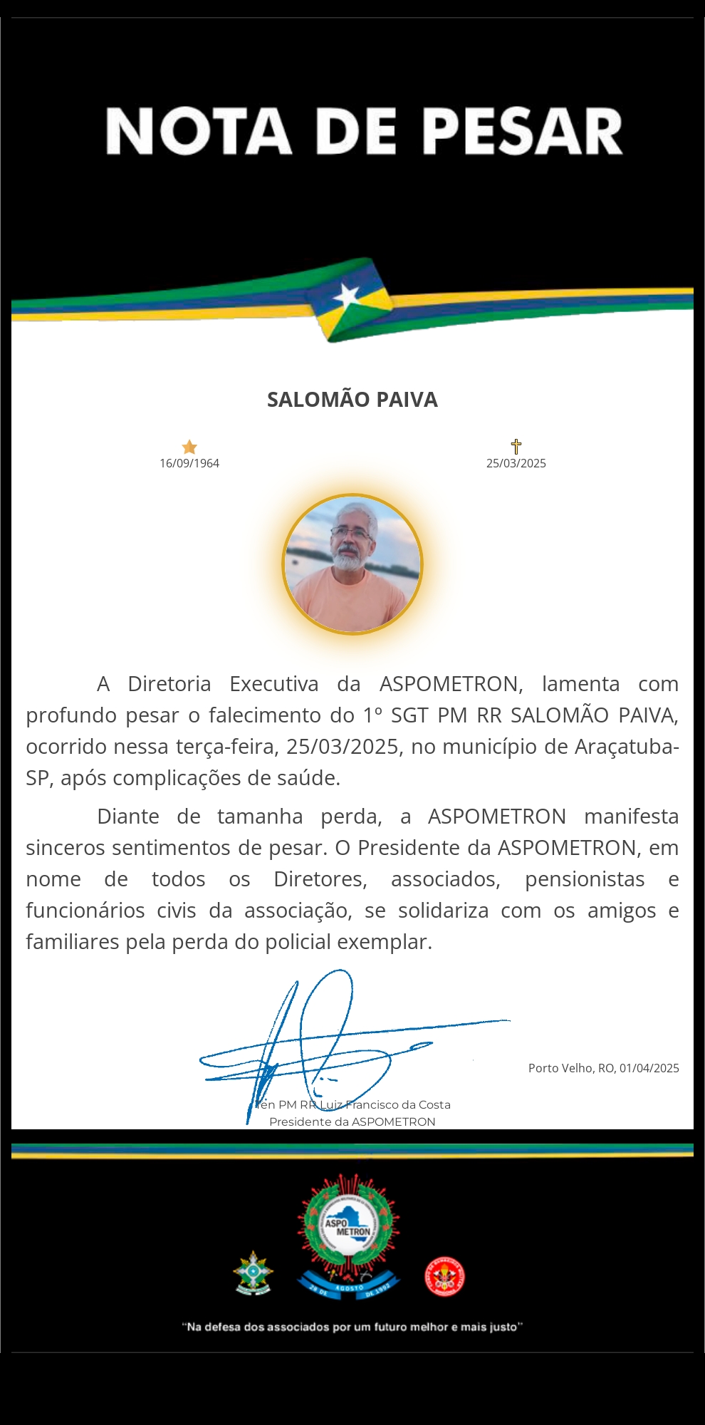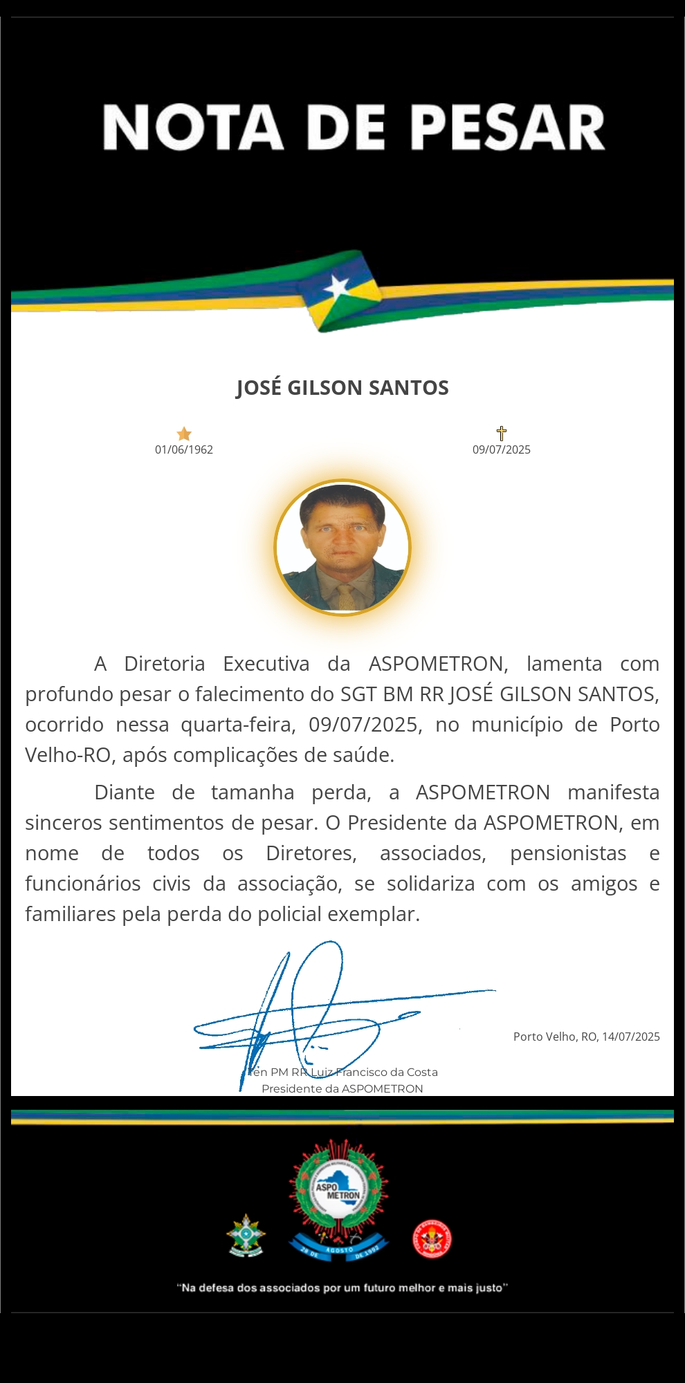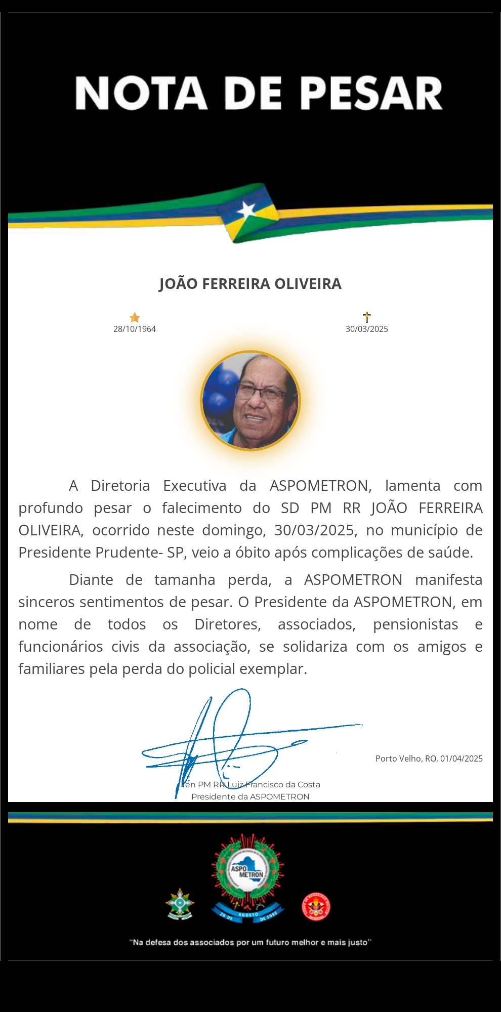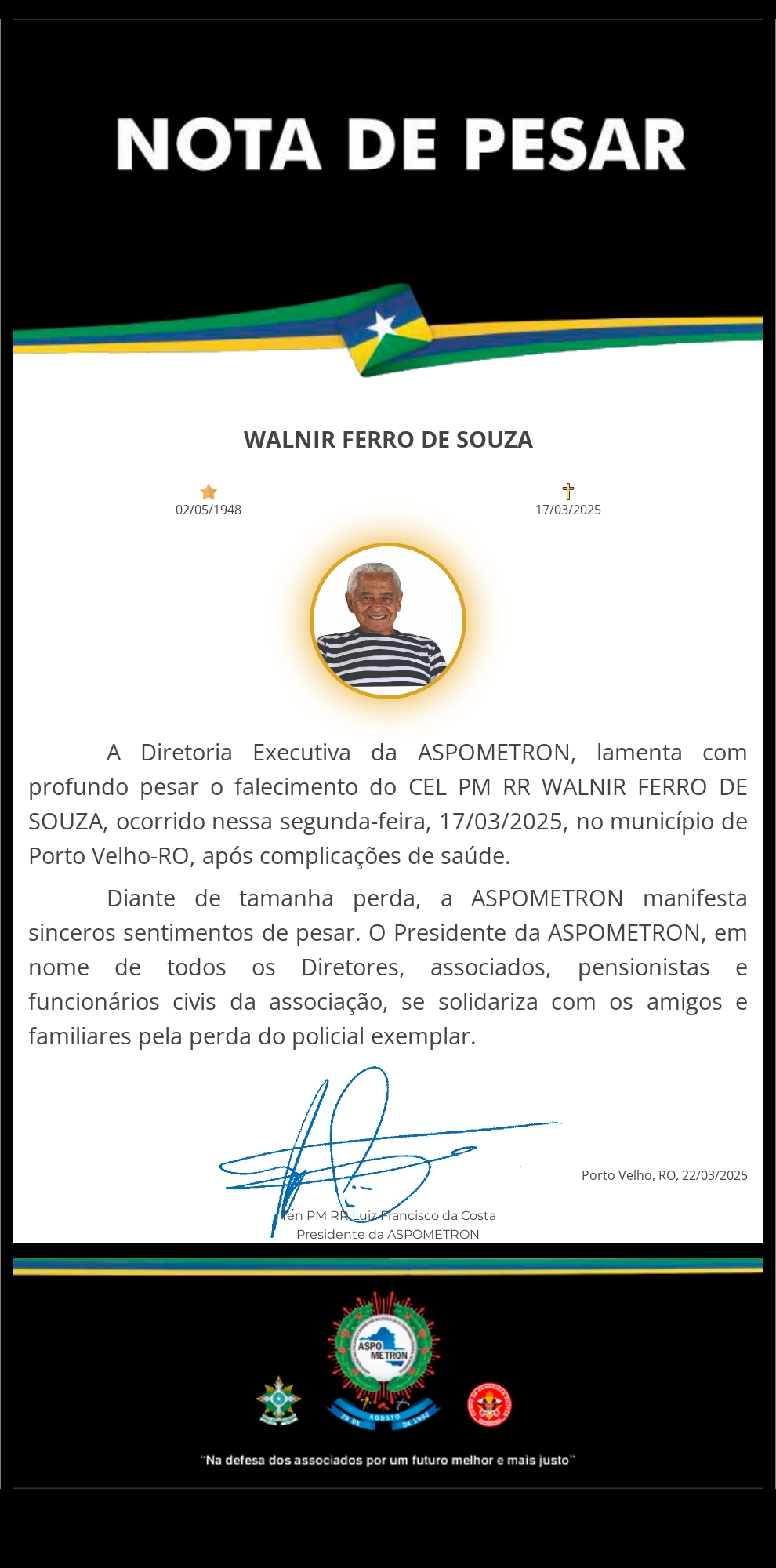 A ASPOMETRON apresenta sua solidariedade à família enlutada!