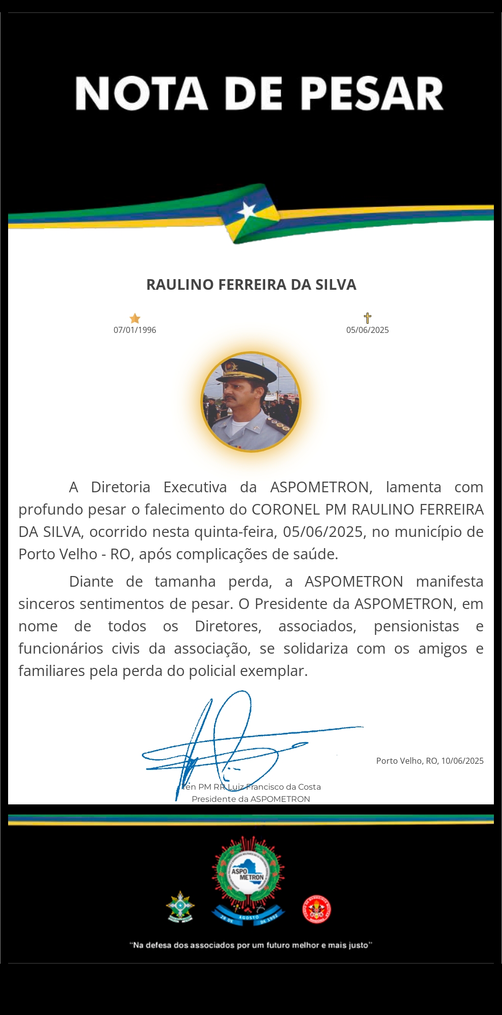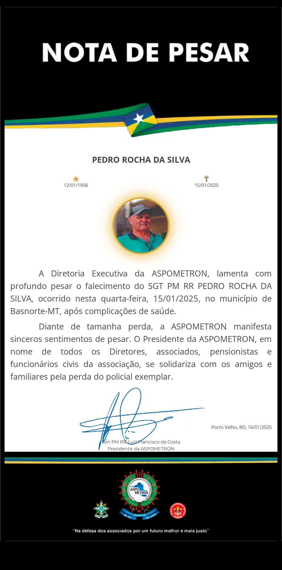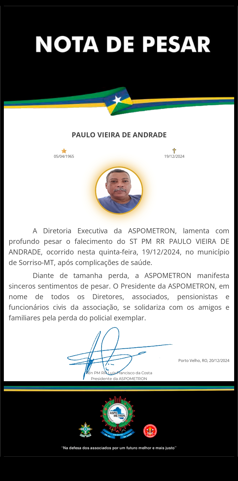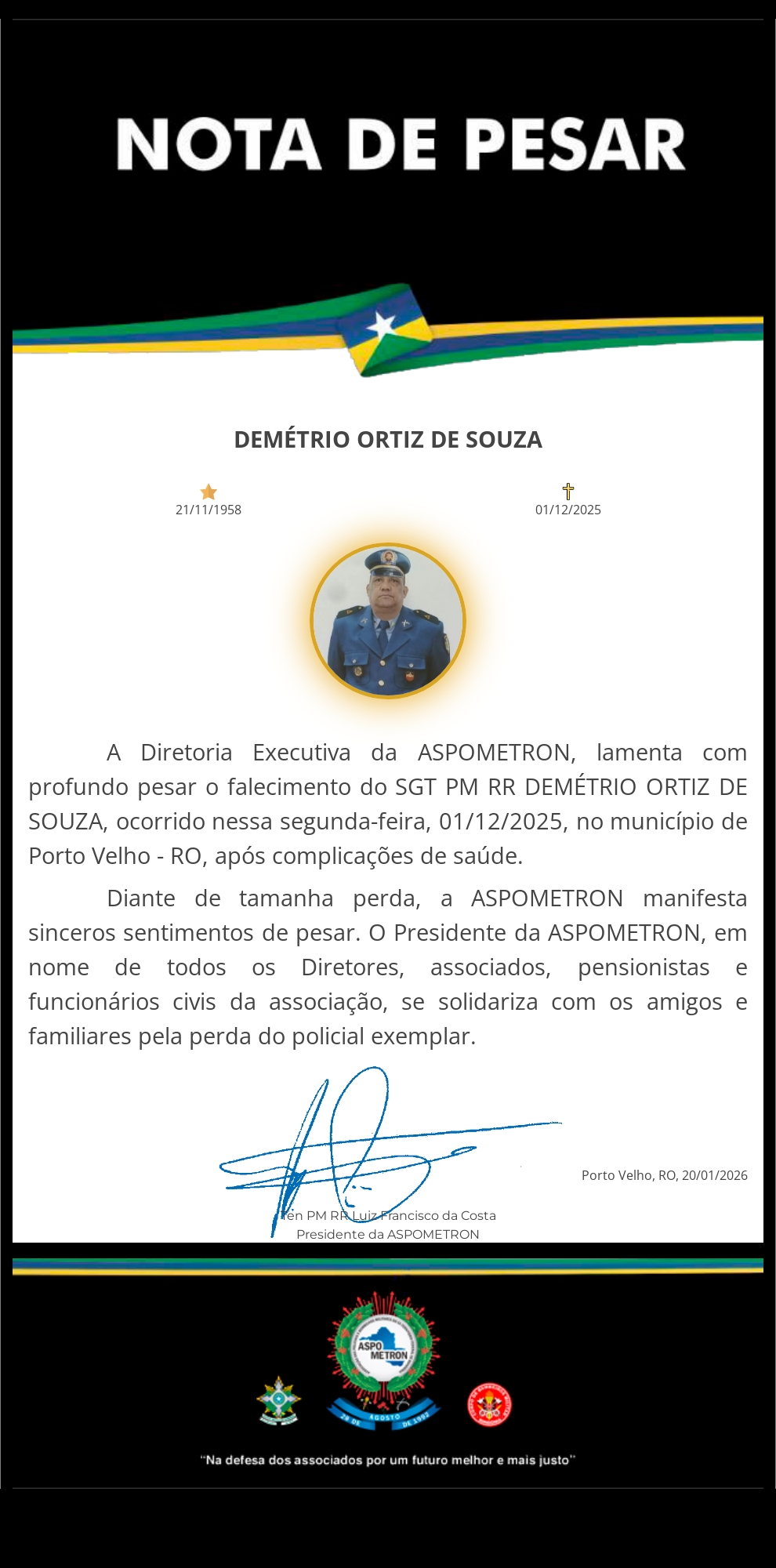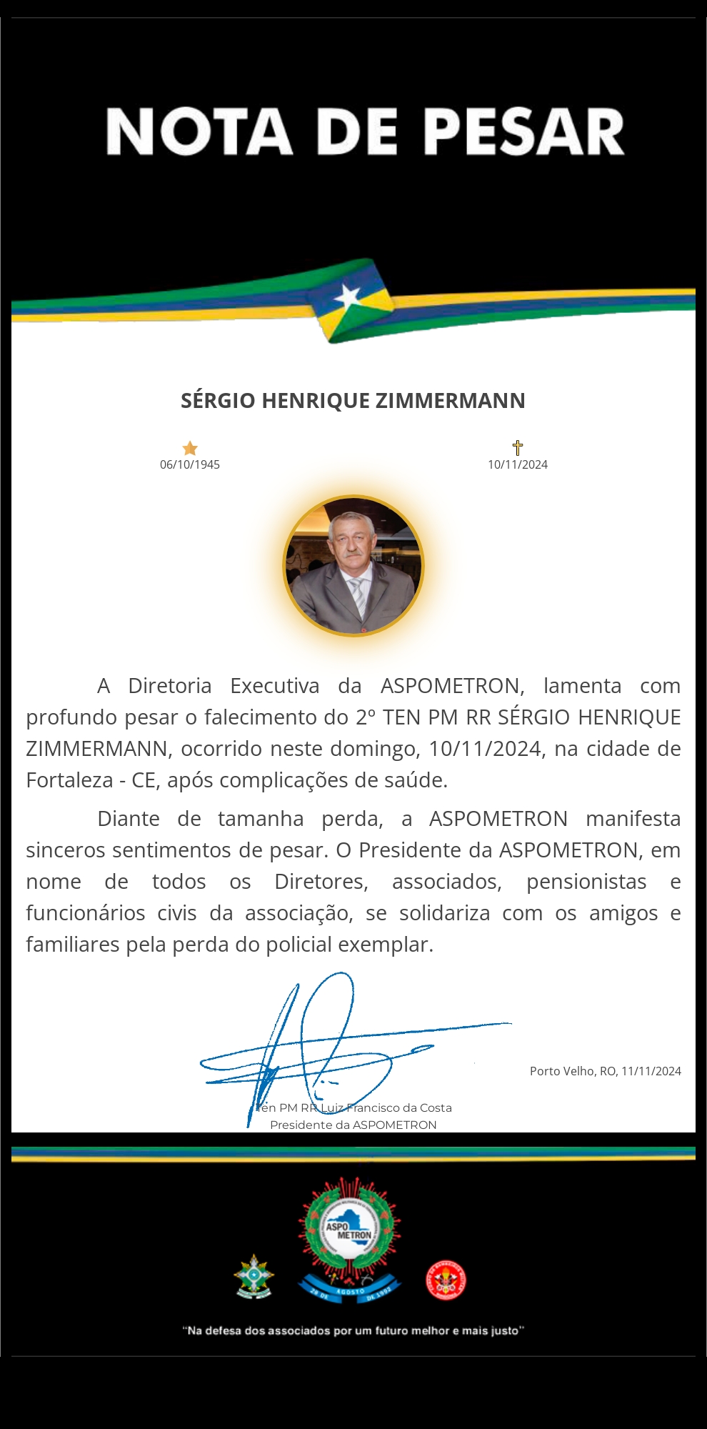 A ASPOMETRON apresenta sua solidariedade à família enlutada!