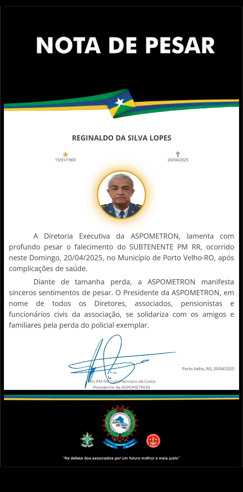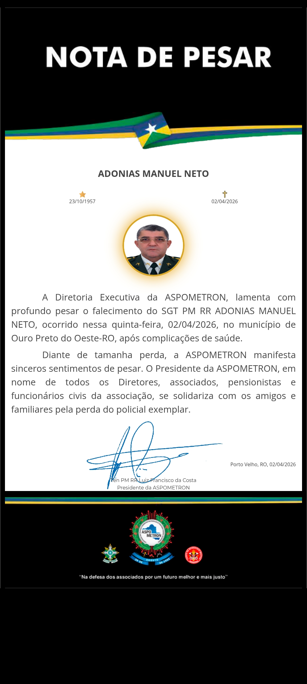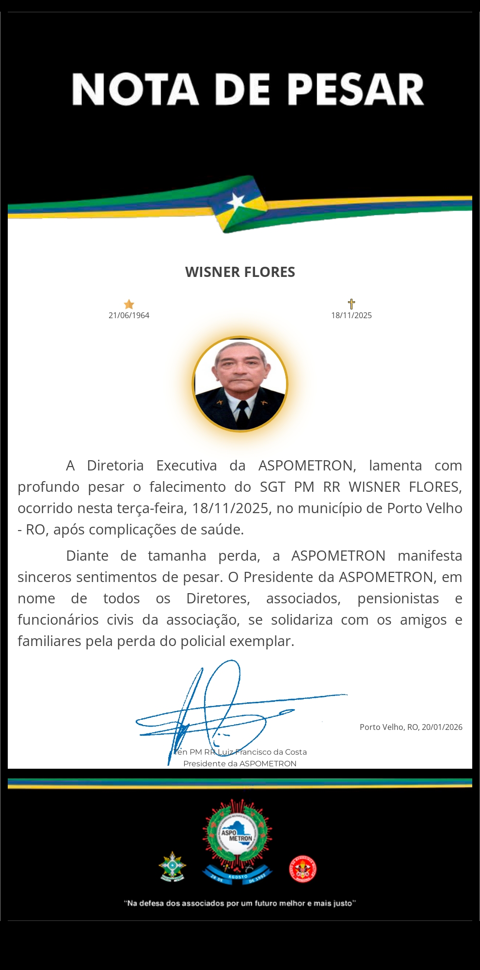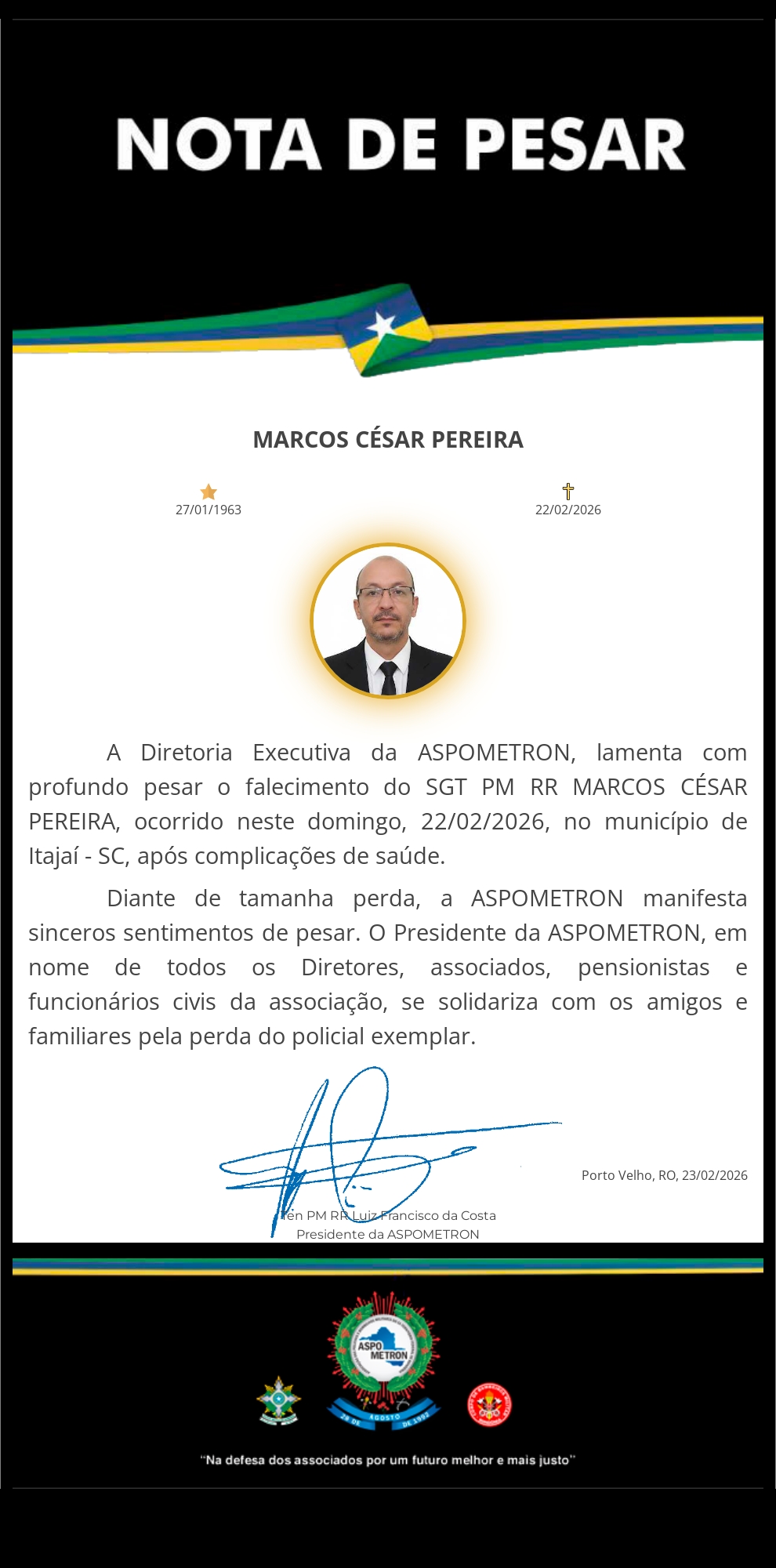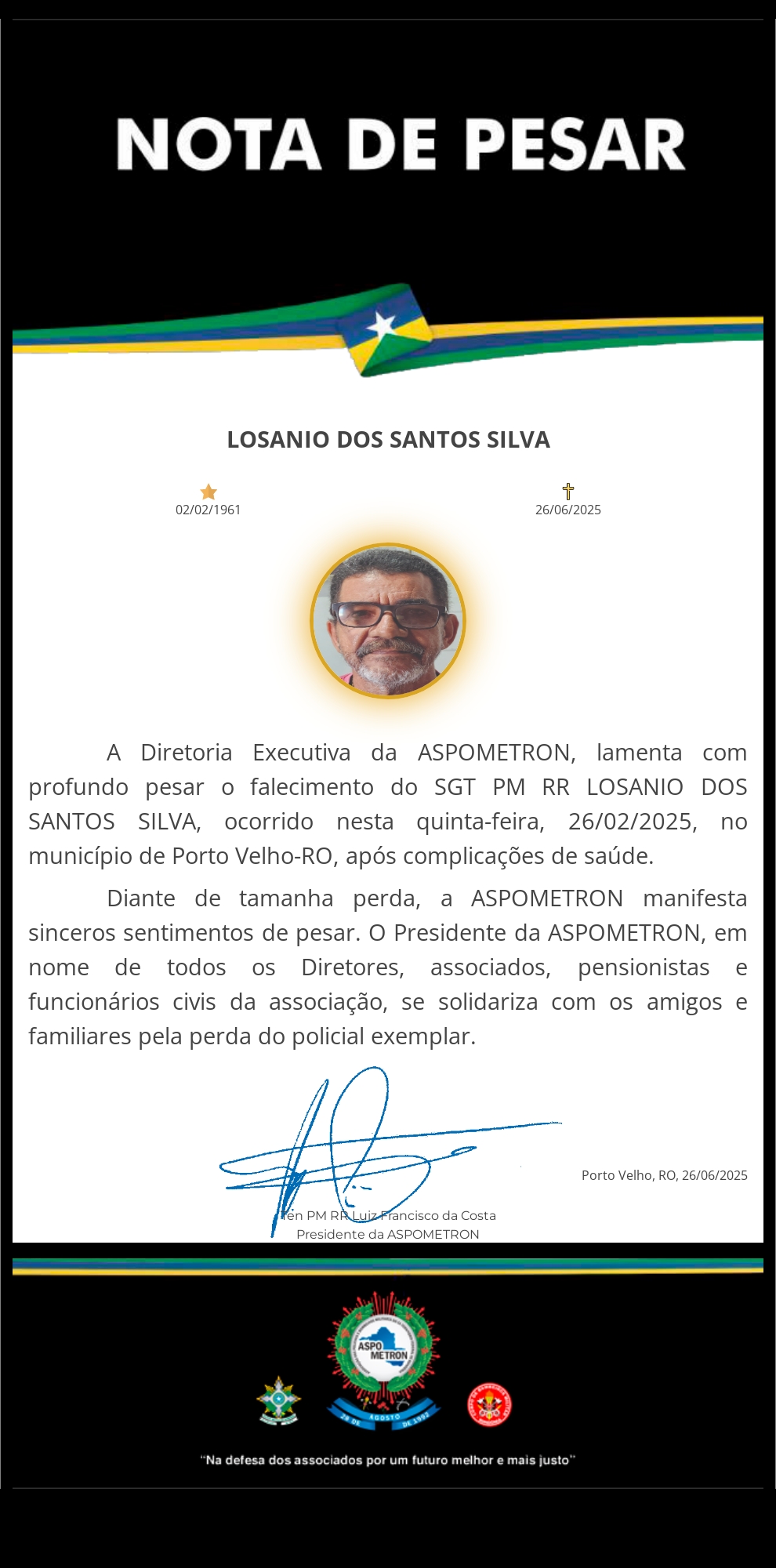 A ASPOMETRON apresenta sua solidariedade à família enlutada!